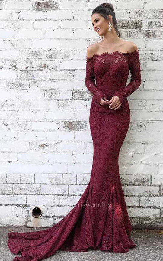 Lace Floor-length Court Train Trumpet Long Sleeve Simple Prom Dress