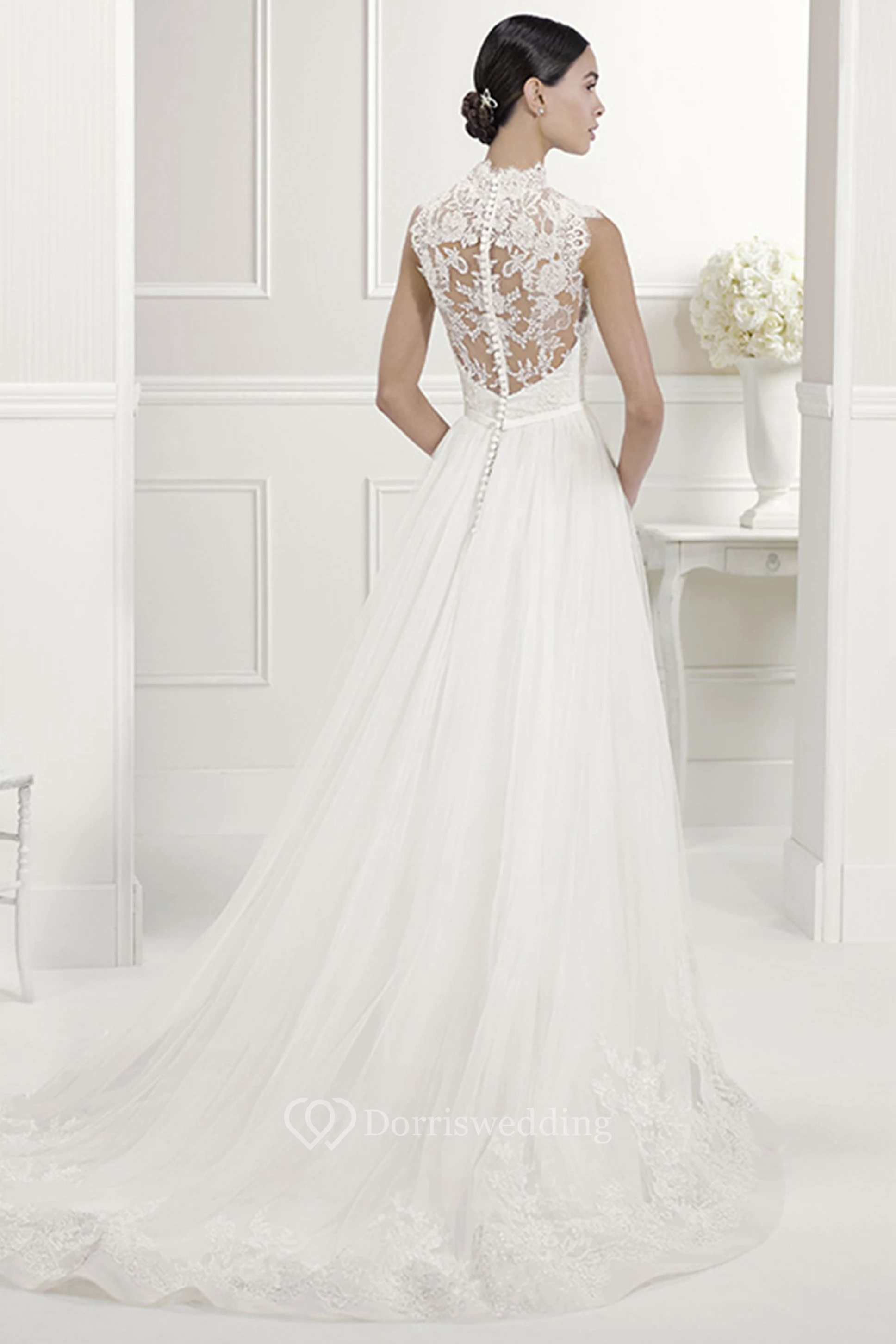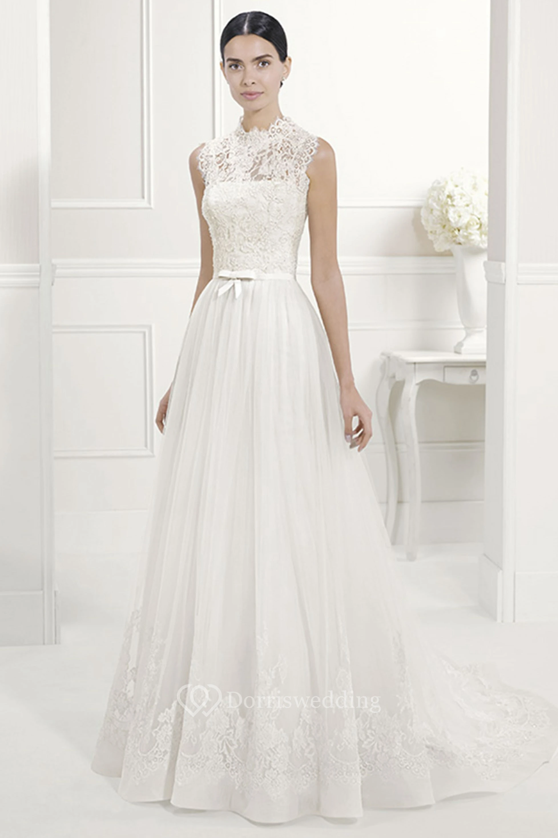 Lace High Neck A-Line Pleated Tulle Bridal Gown With Bow