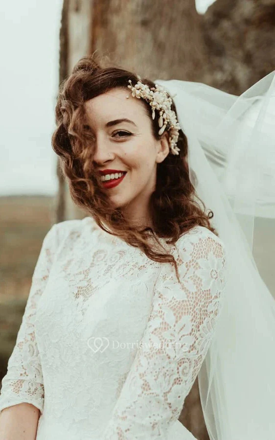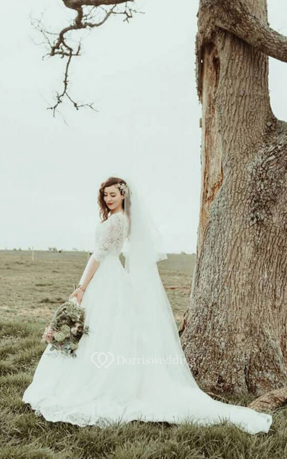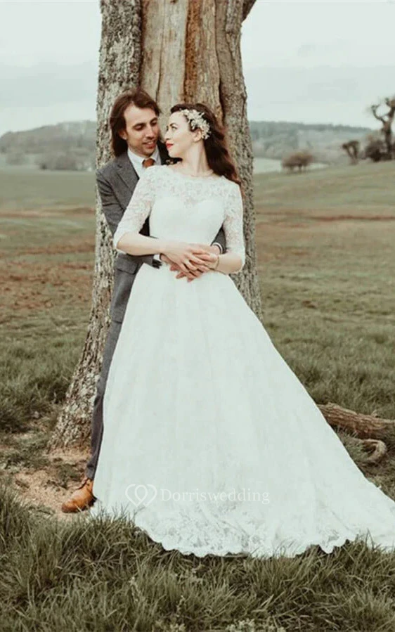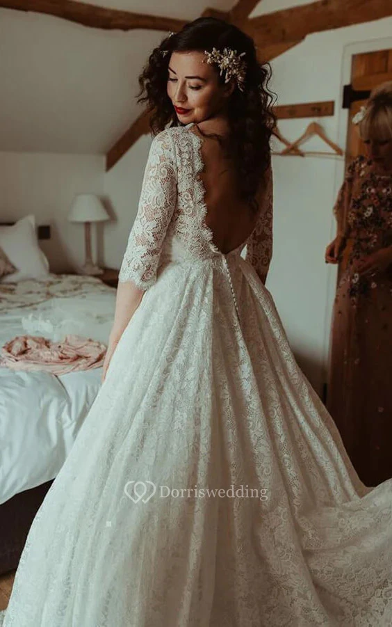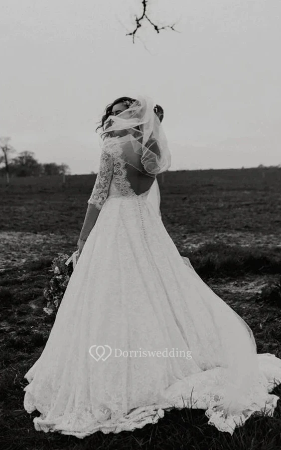 Lace Scoop-neck Half-sleeve A-line Keyhole Ball Gown Modest Wedding Dress