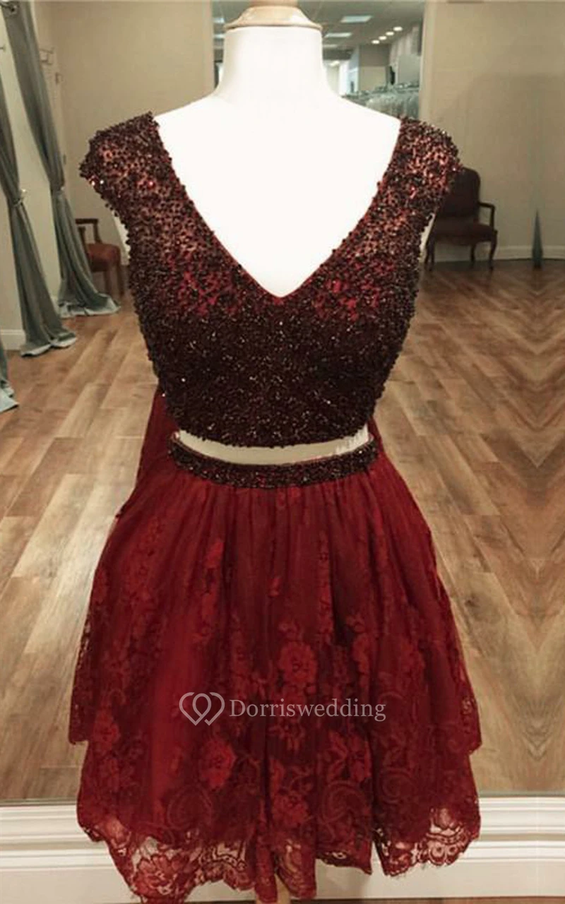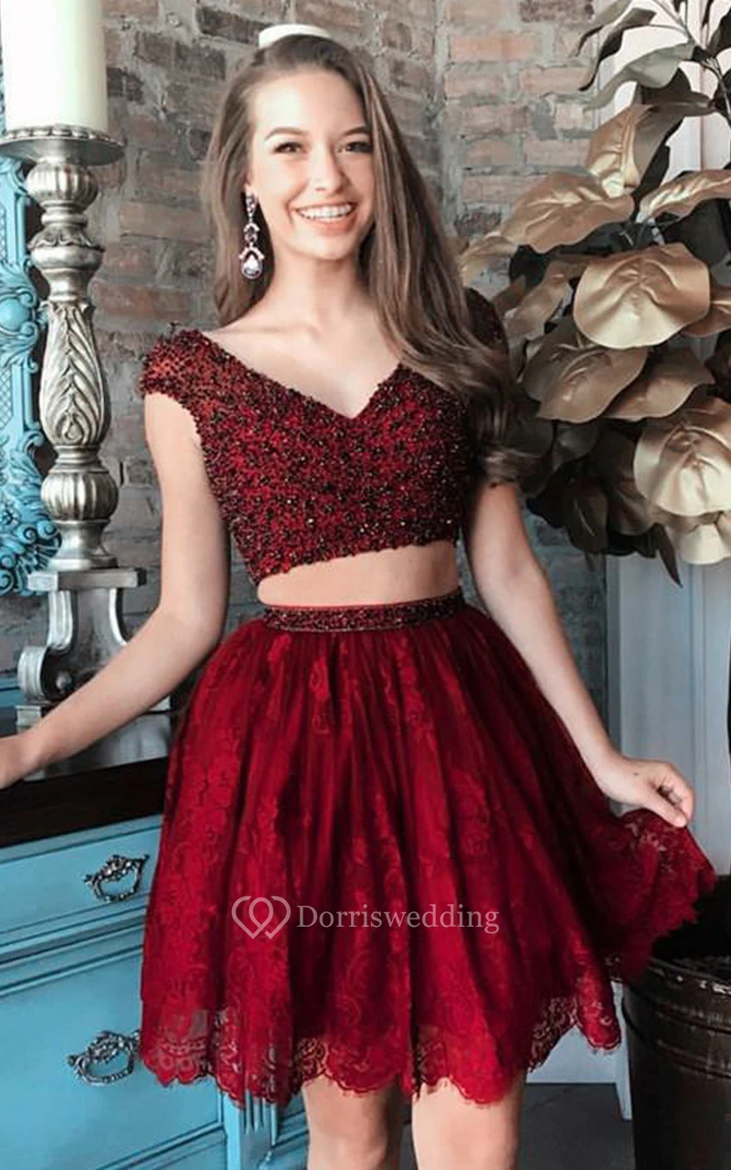 Lace Short Two Piece Short Sleeve Adorable Homecoming Dress with Pleats