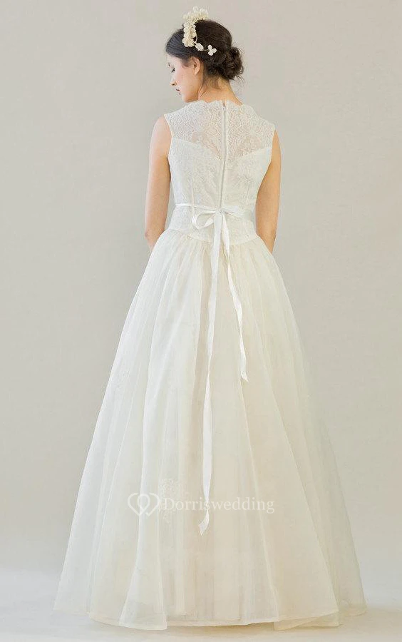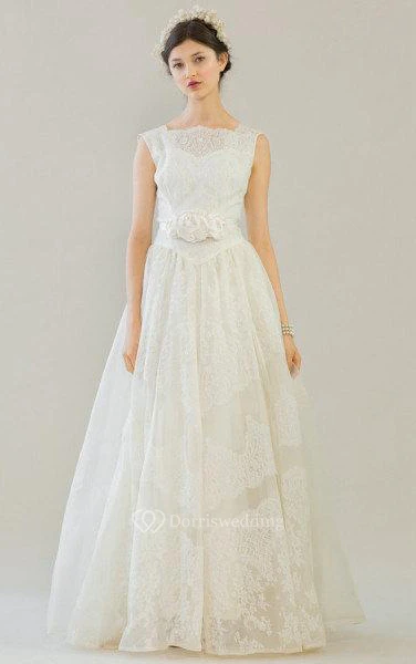 Lace Sleeveless A-Line Dress With Floral Embellishment and Slim Bow