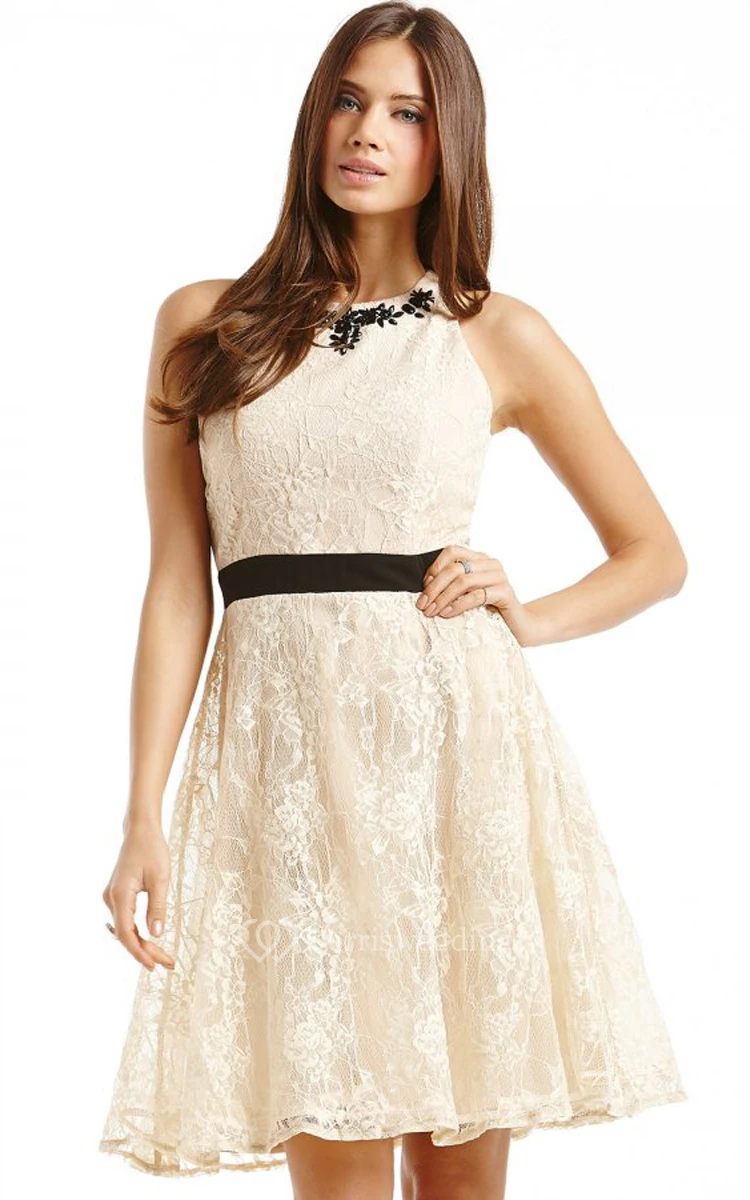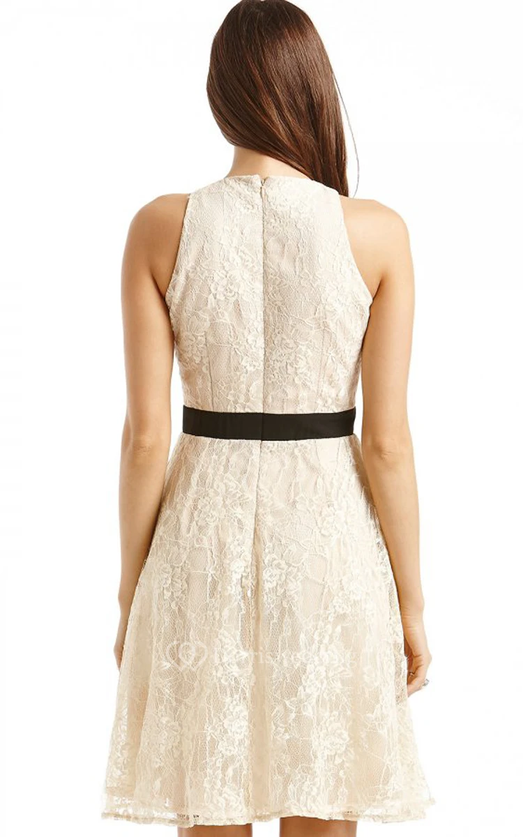 Lace Sleeveless Dess Short Dress With Satin Sash