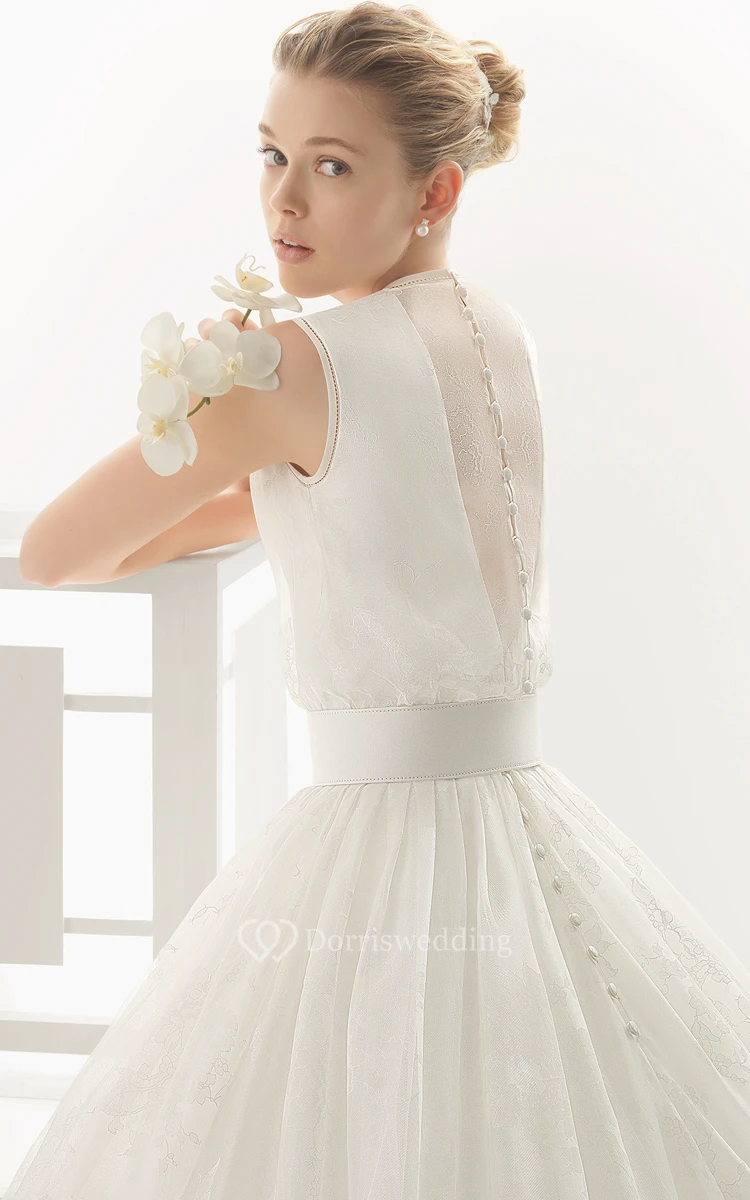 Lace Sleeveless Jewel-Neck Gown With Wide Belt