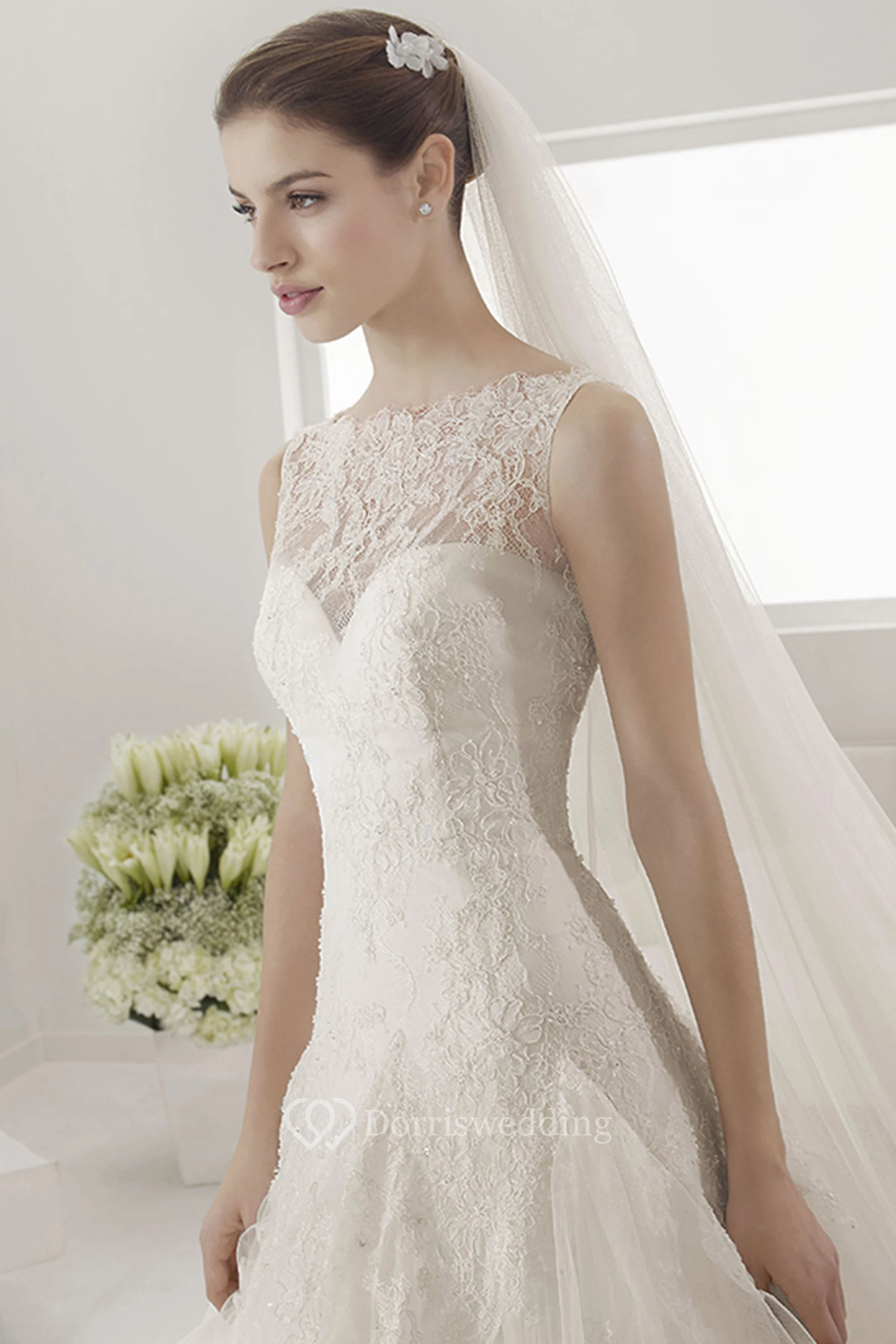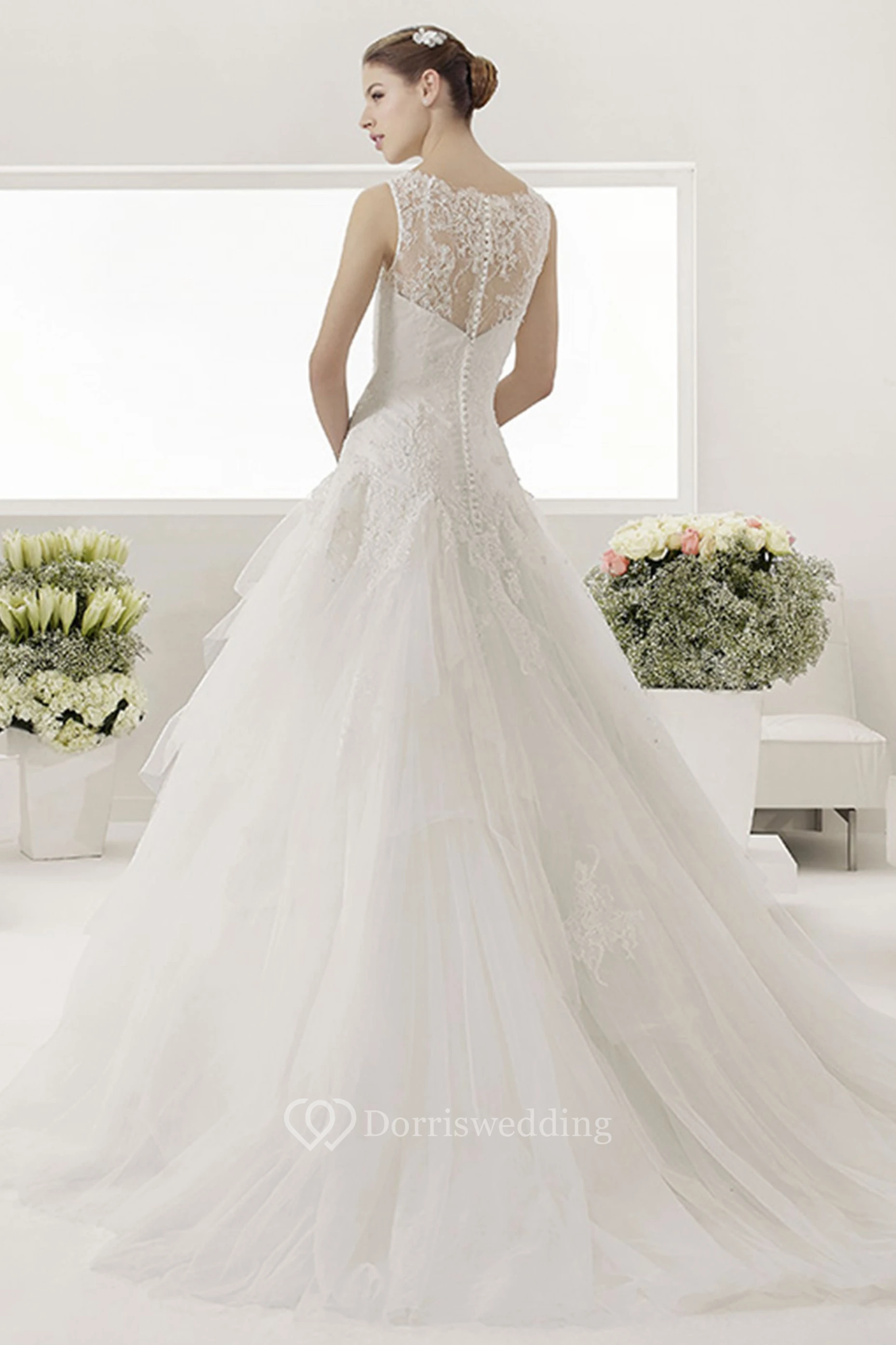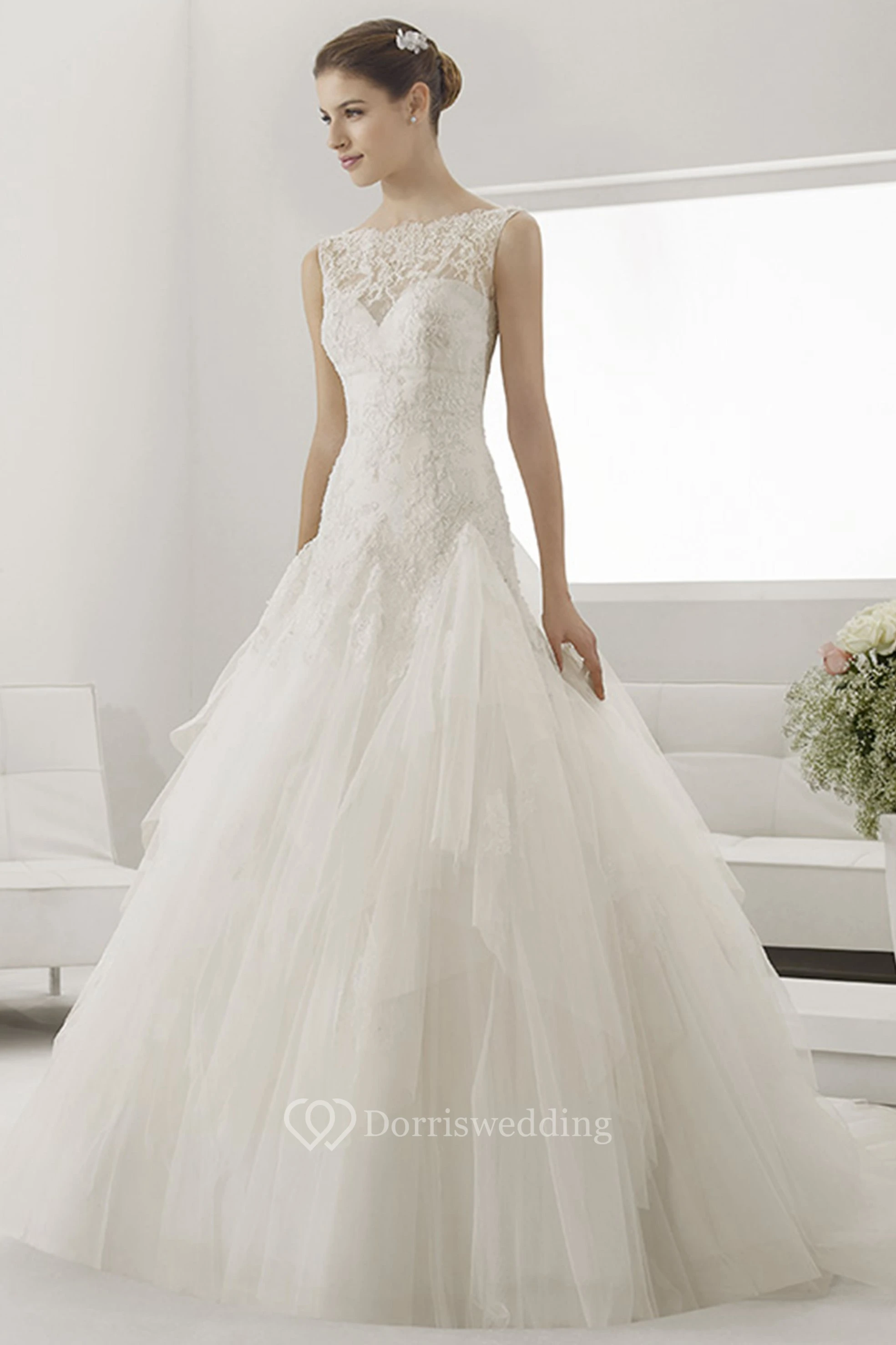 Lace Top Bateau Neck Drop Waist Bridal Gown With Layered Tulle Skirt