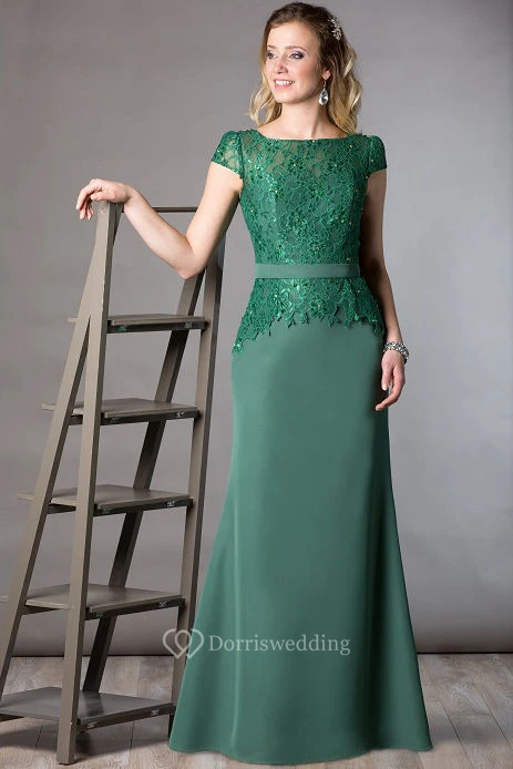Lace Top Cap Sleeve Sheath Long Mother Of The Bride Dress With Crystal Details