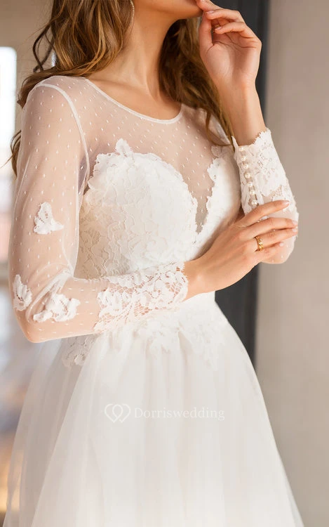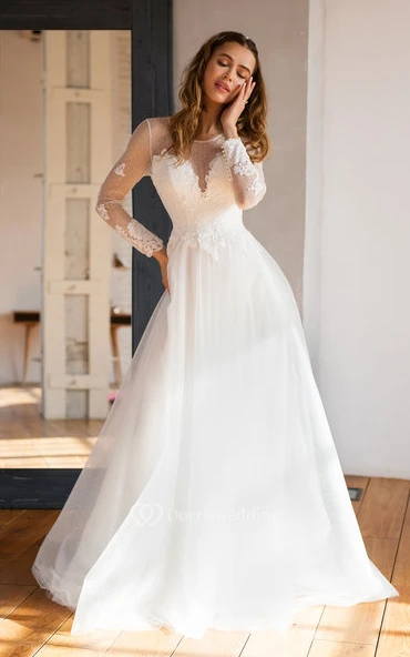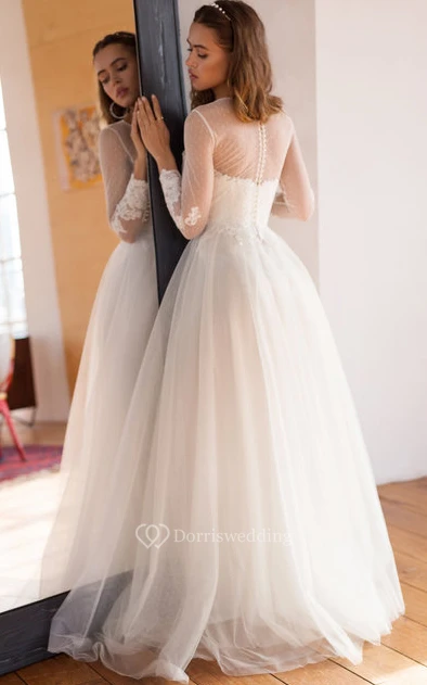 Lace Tulle Floor-length A Line Long Sleeve Modest Wedding Dress with Beading