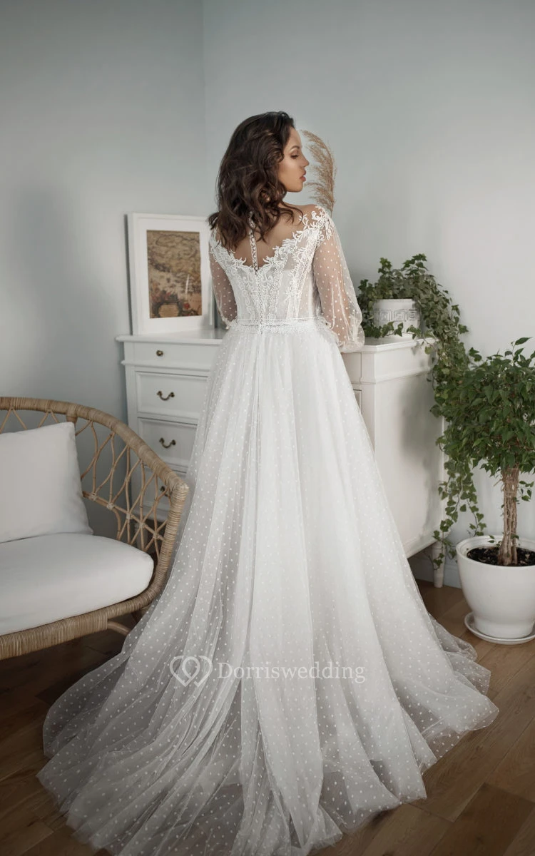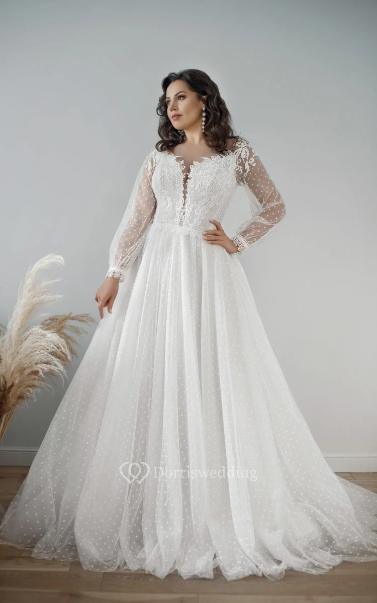Lace Tulle Plus Size Illusion Long Sleeve V-neck Plus Size Modest Wedding Dress