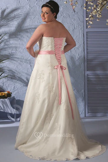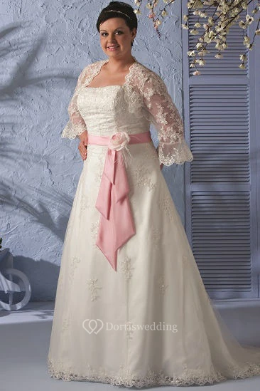 Lace-Up Bridal Gown With Pink Floral Sash And Lace Removable 3-4-Sleeve Jacket