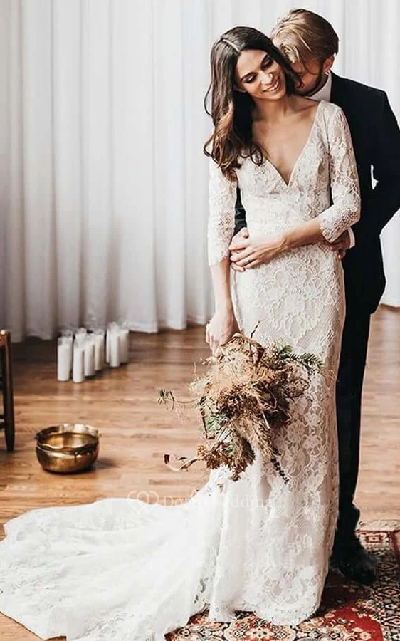 Lace V-neck 3-4-sleeve Sheath Applique Vintage Boho Wedding Dress with Court Train