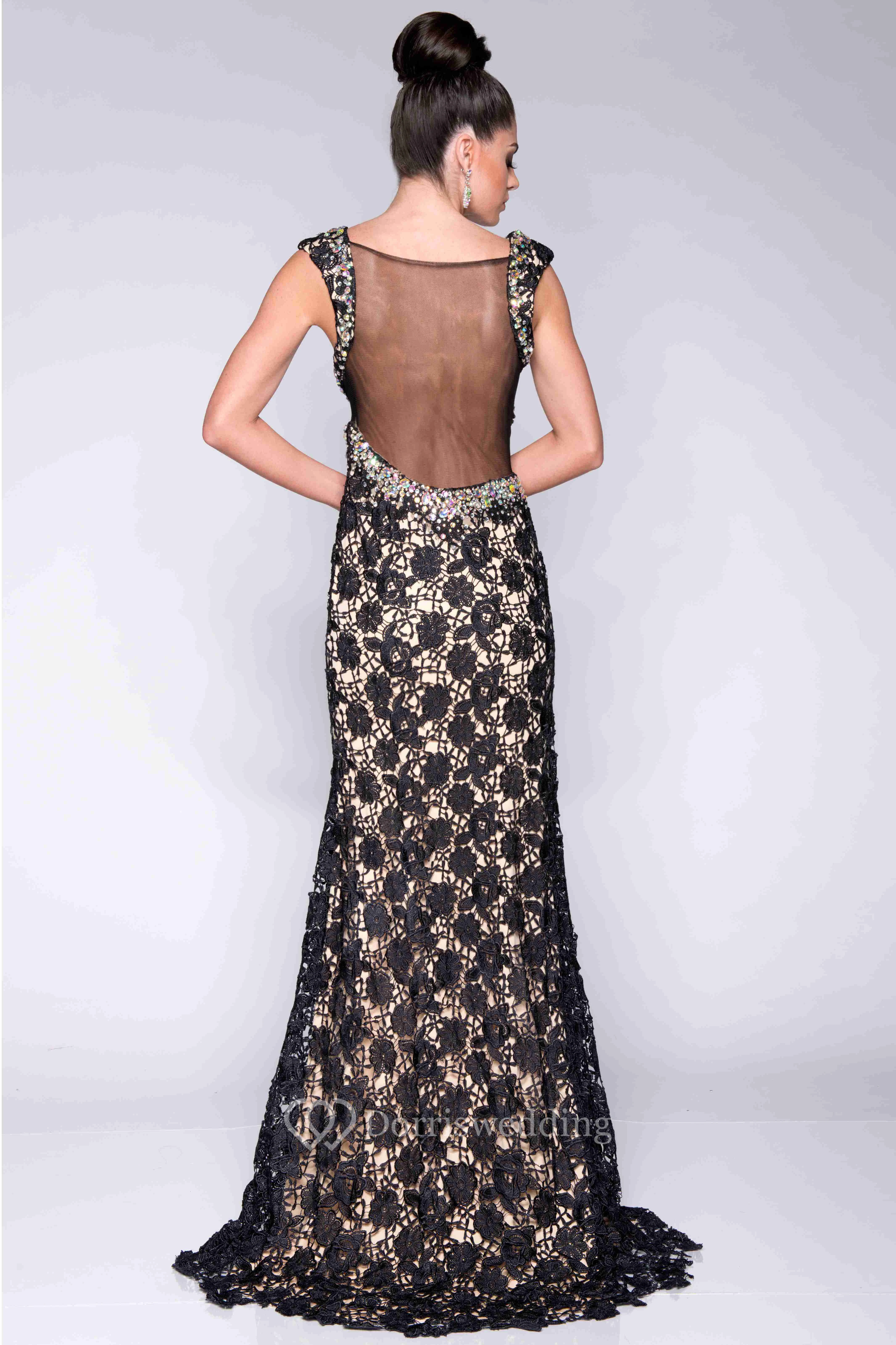 Lace V-Neck A-Line Sleeve Side Slit Prom Dress With Illusion Back