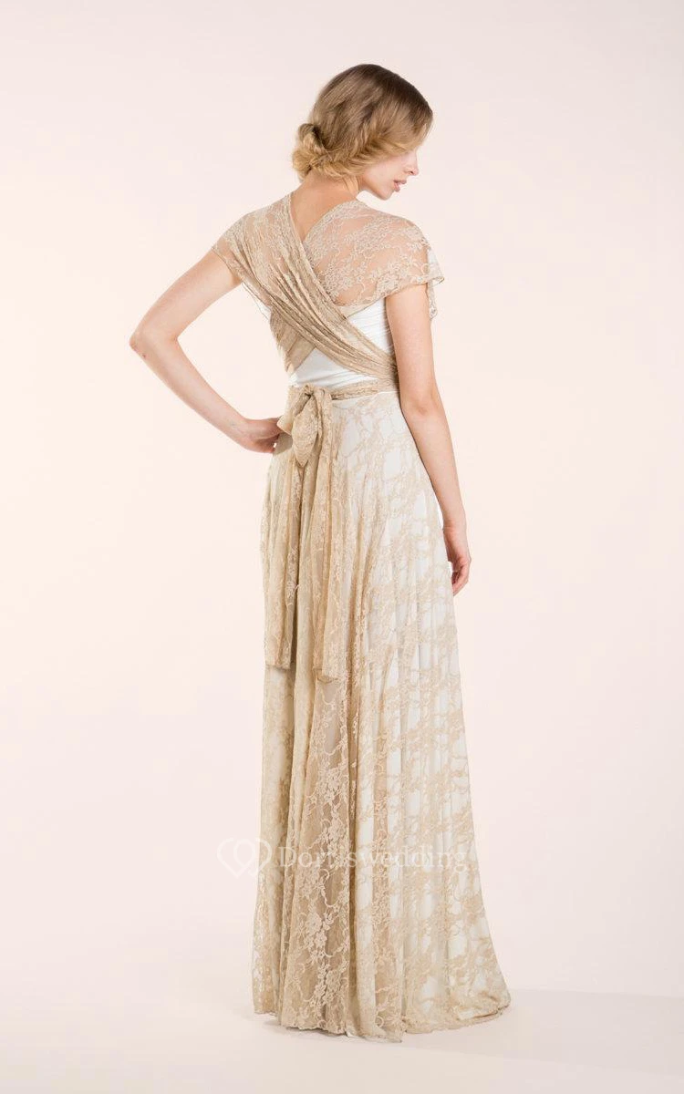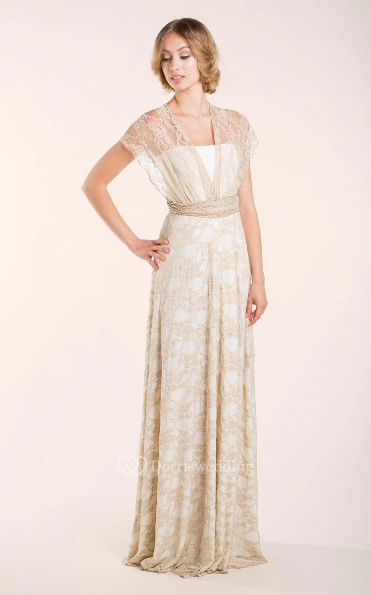 Vintage Sheath Cap-Sleeve Lace Vow Renewal Dress With Bow