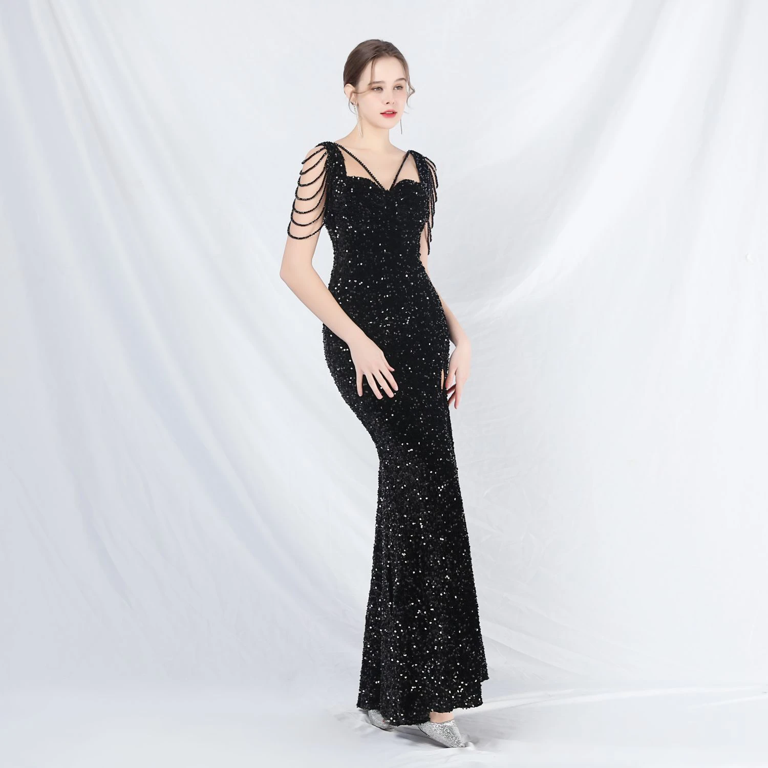 Ladies And Celebrities Formal Occasions Velvet-Bottomed Hand-Beaded Long Evening Dress