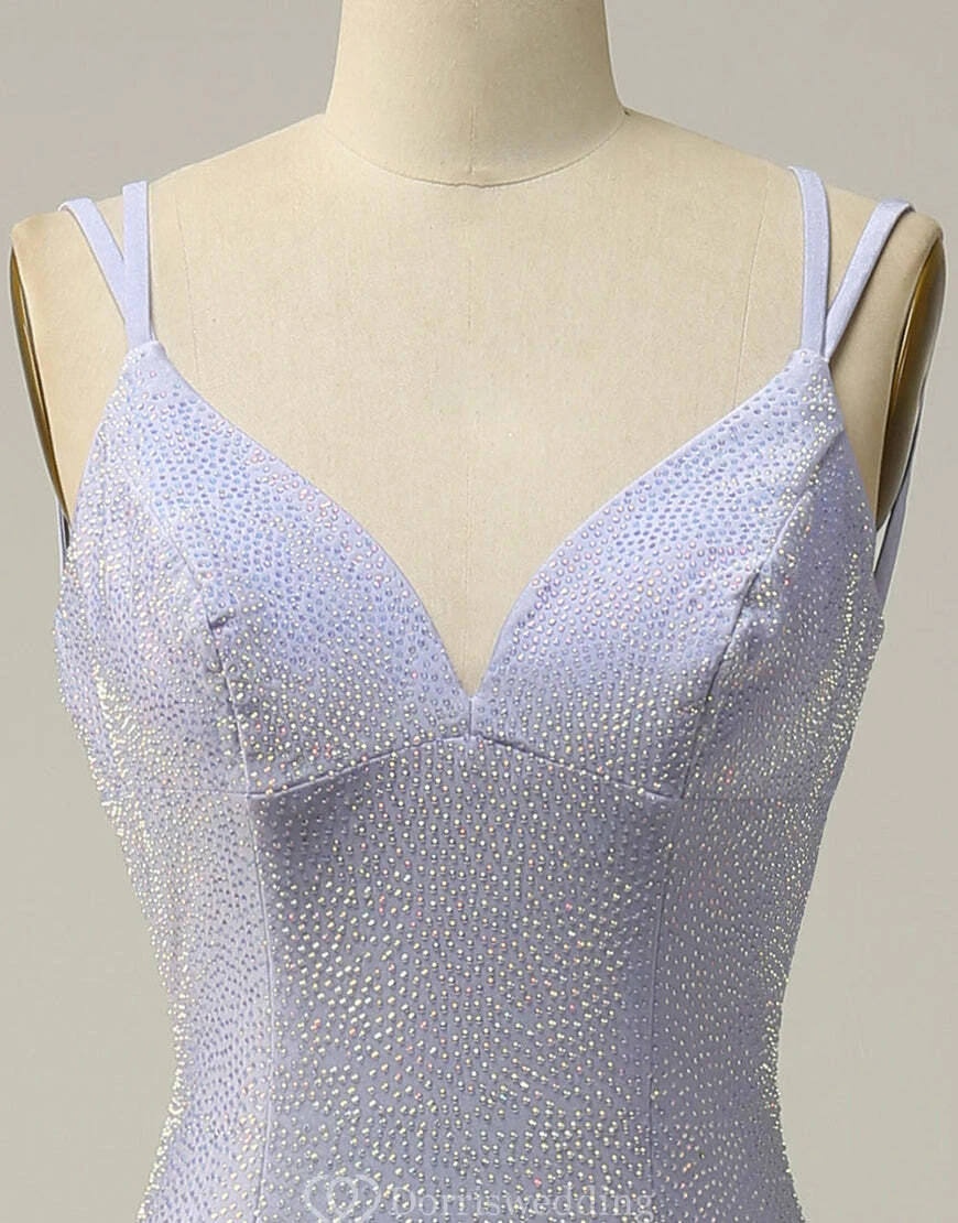 Elegant lavender mermaid dress with dual thin straps, a sweetheart neckline and full‑length sequin embellishment that catches the light; fitted through the hips before flaring into a modest train—a perfect blend of sparkle and sophistication.