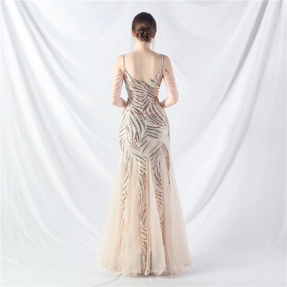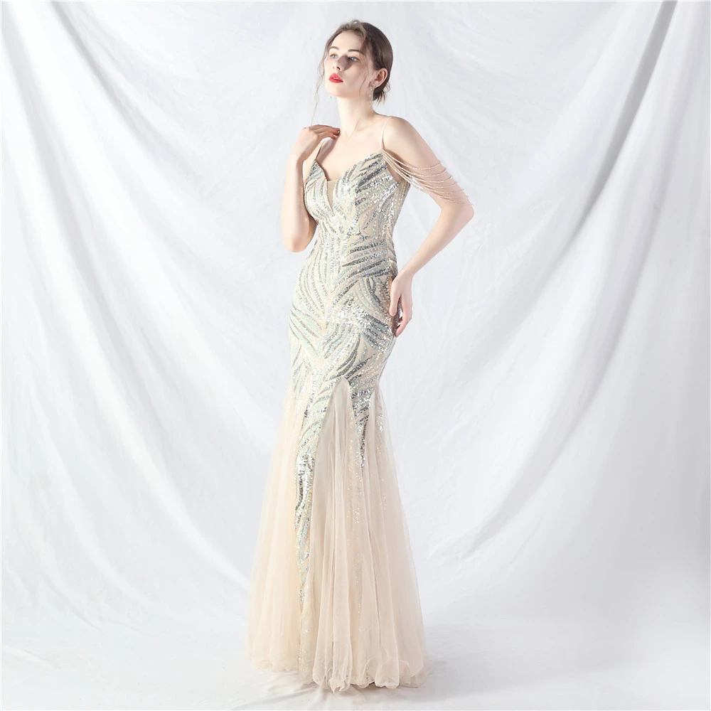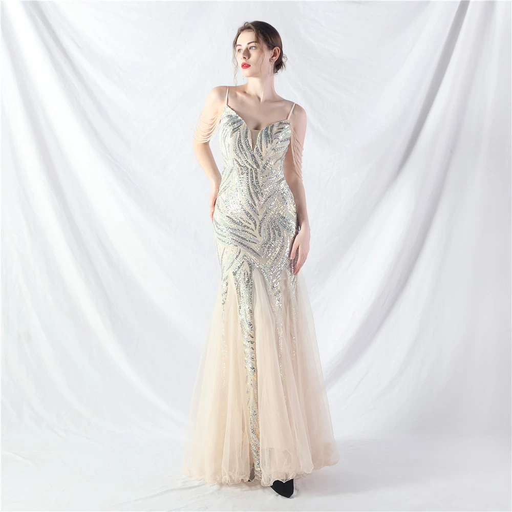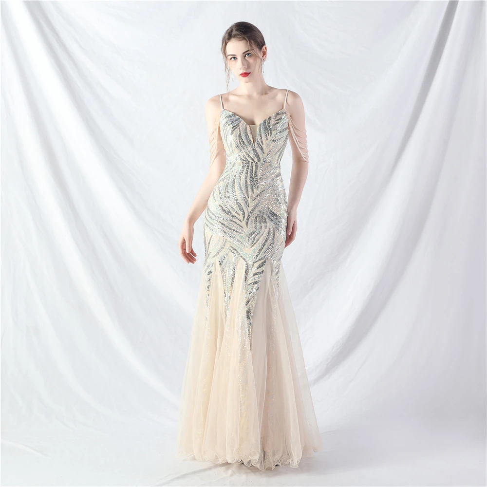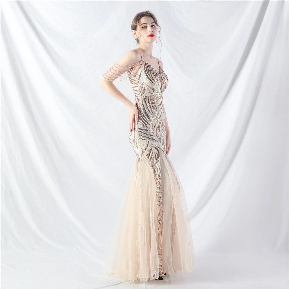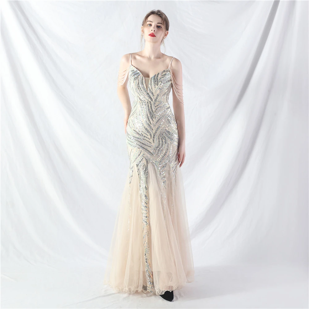 Layered Beads Spliced Mesh High-End Evening Dress