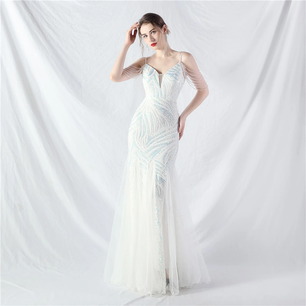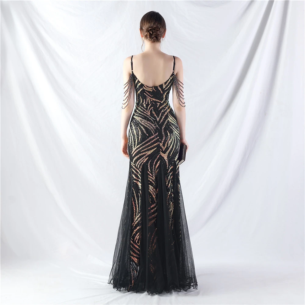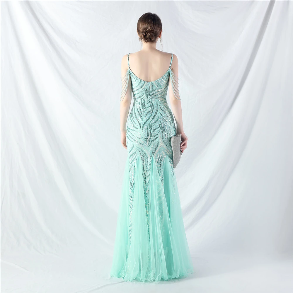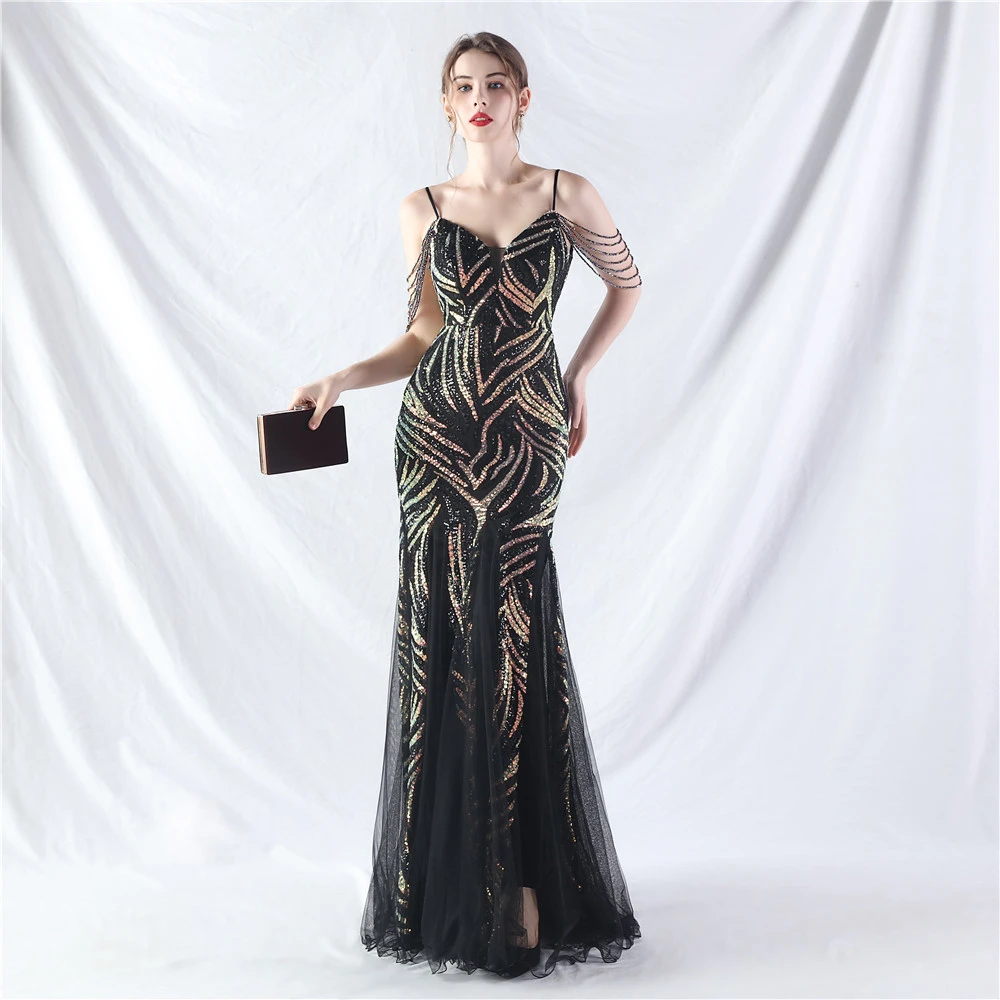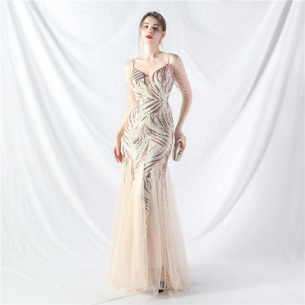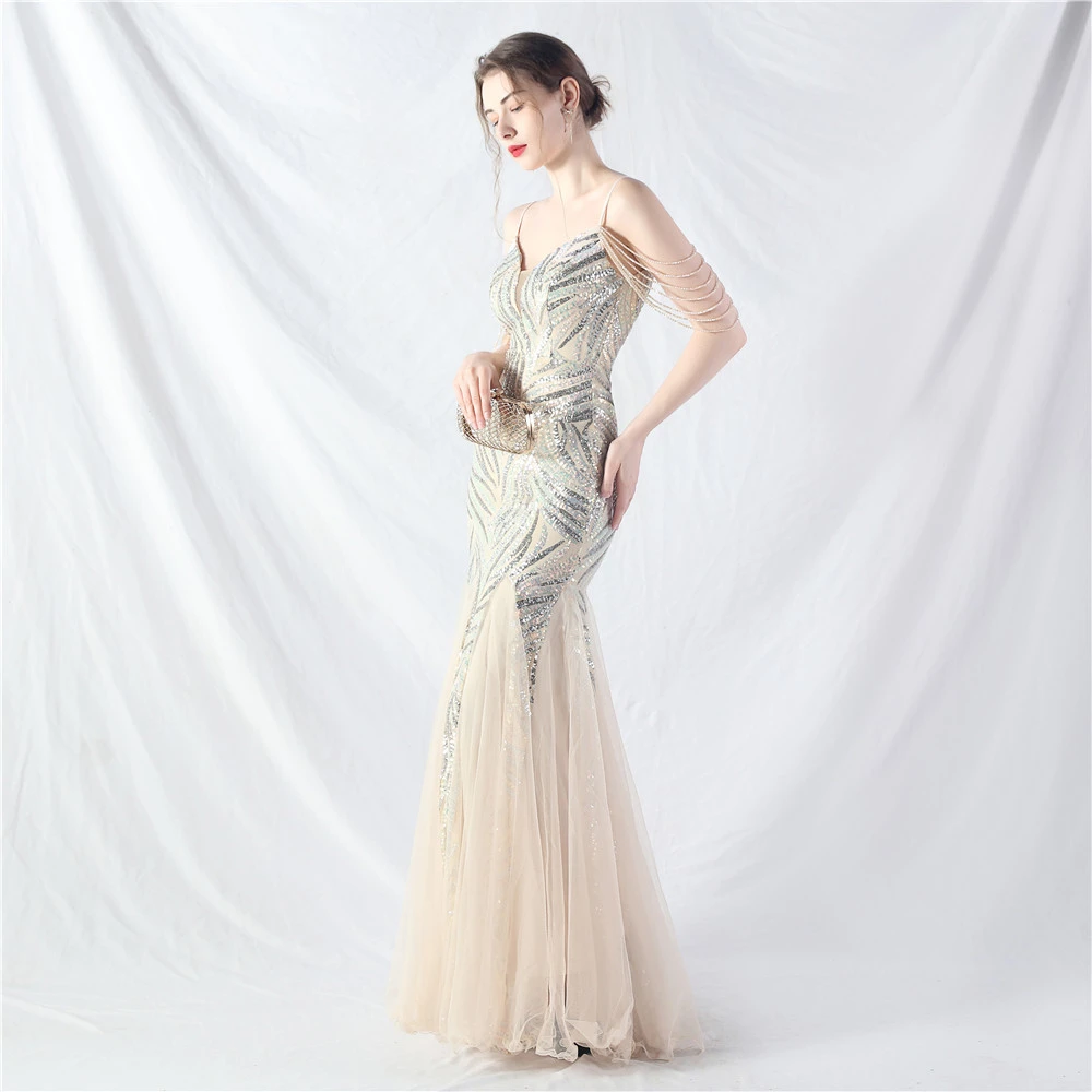 Layered Beads Spliced Mesh High-End Evening Dress