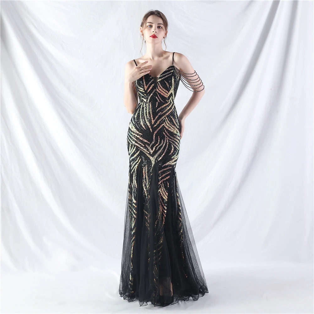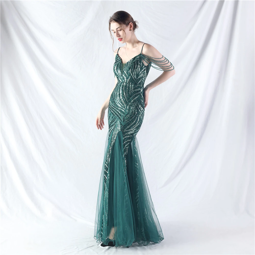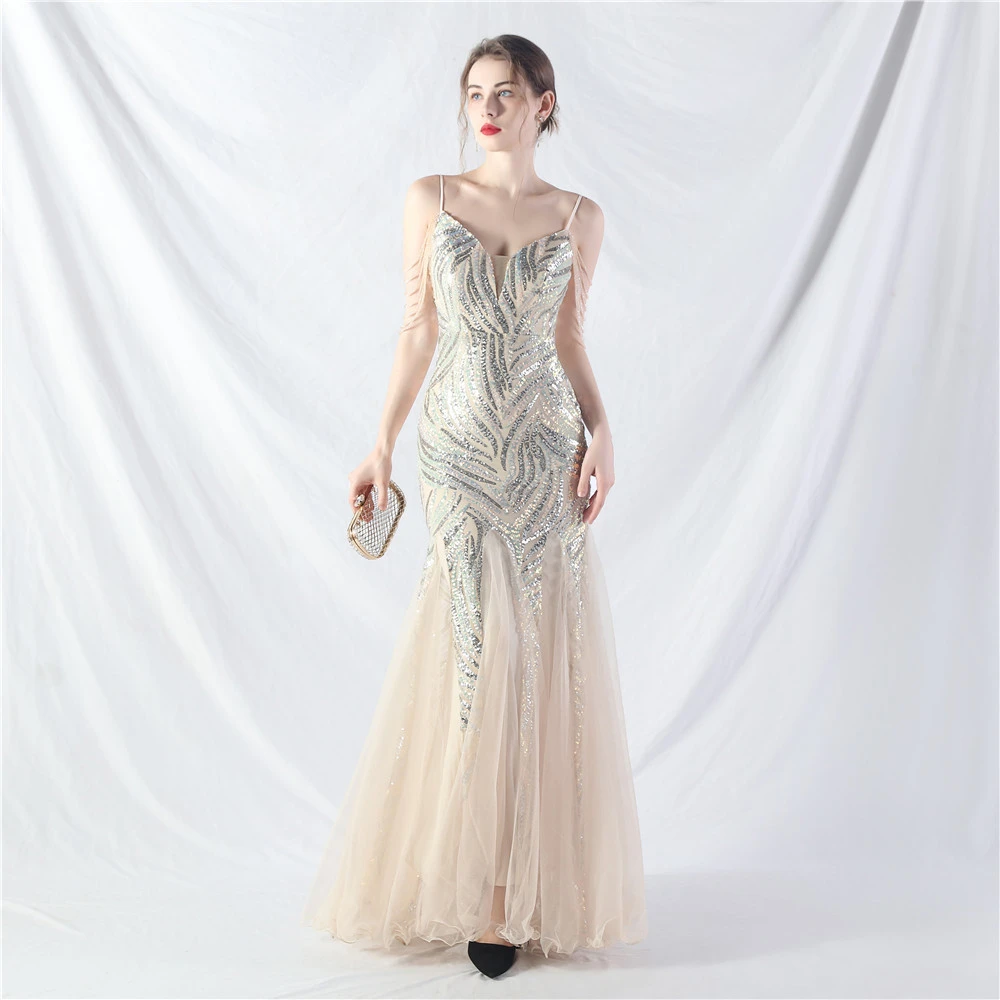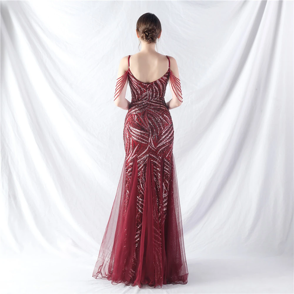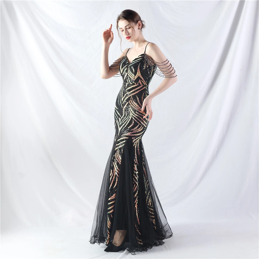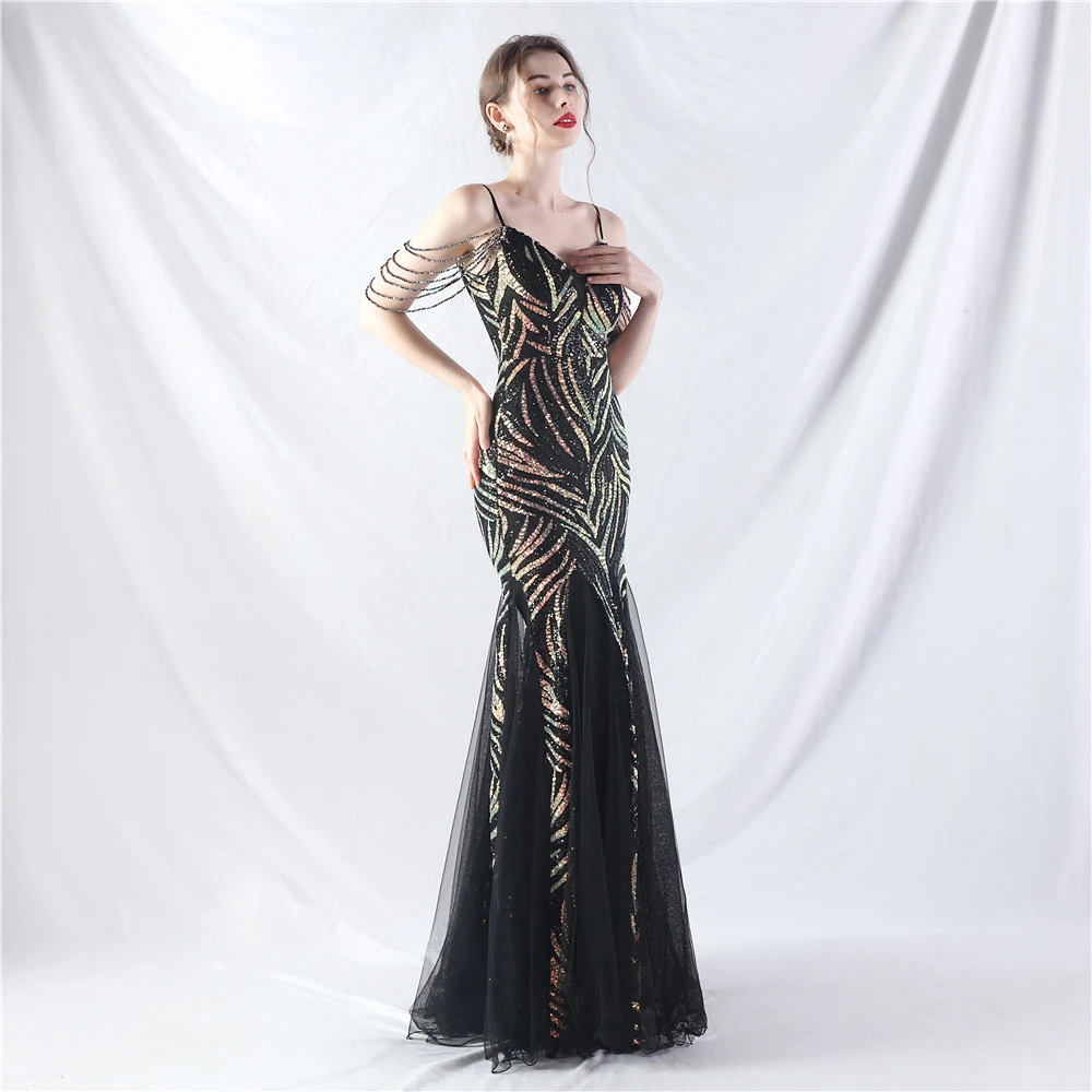 Layered Beads Spliced Mesh High-End Evening Dress