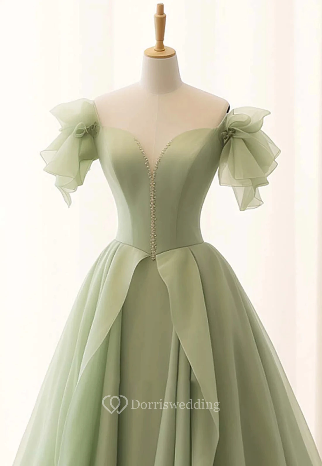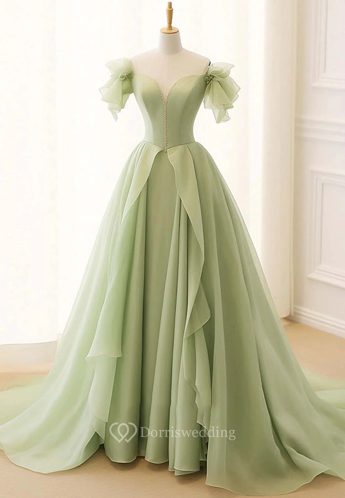 This elegant light green gown features an off-the-shoulder design with a large bow accent, and a voluminous multi-layer tulle skirt with ruffled details. The design is sophisticated and romantic, perfect for formal events or weddings. The lightweight fabric ensures comfort and movement, making it ideal for special occasions.