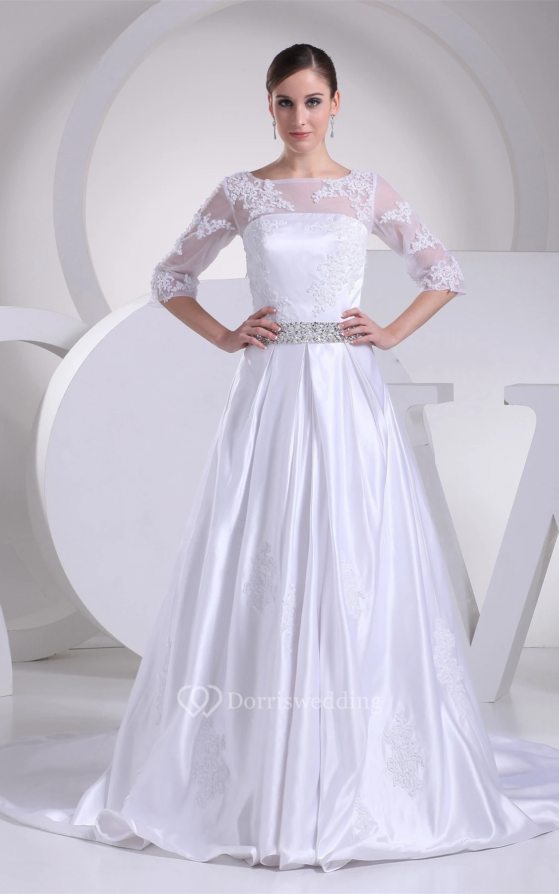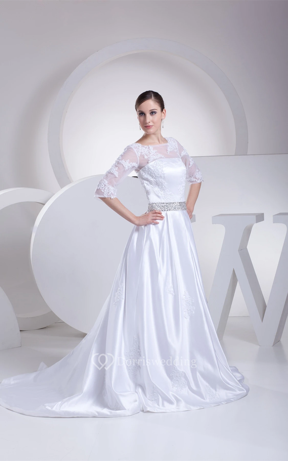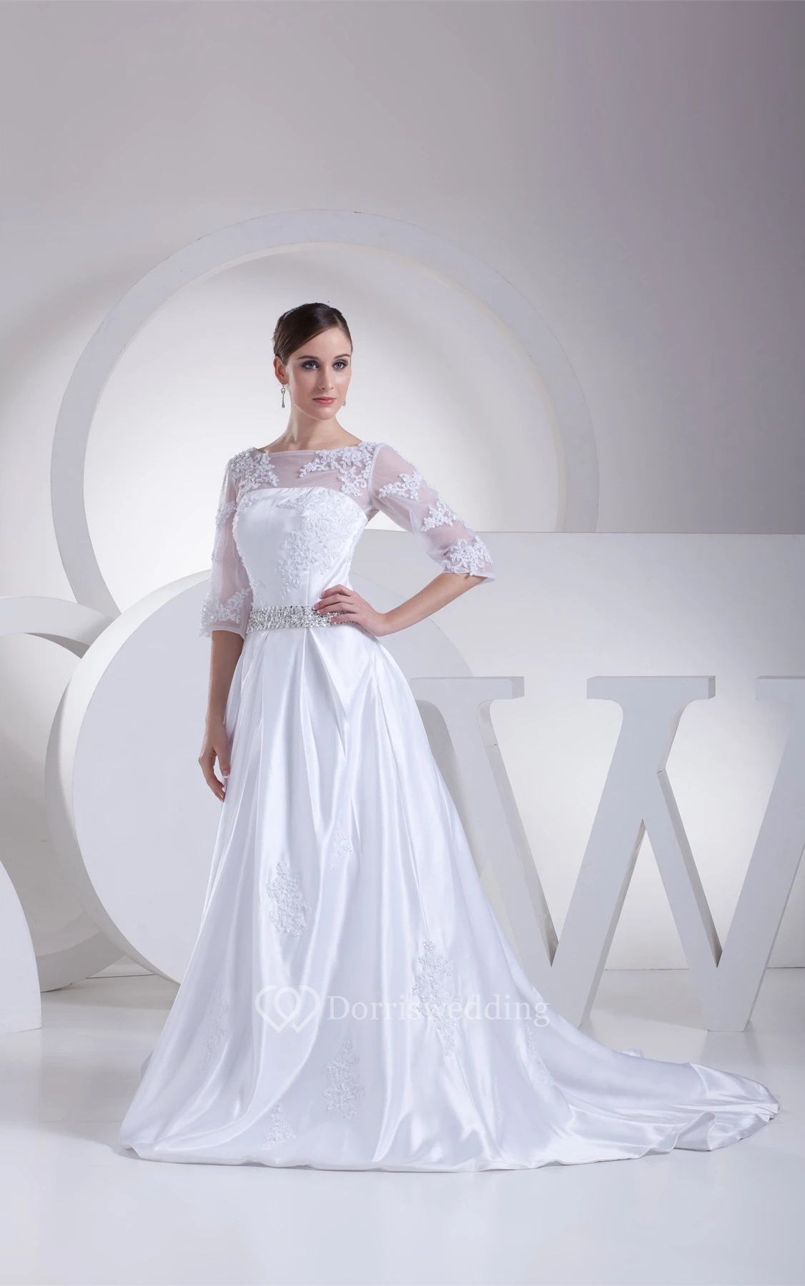 Long A-Line 3-4 Length Satin Sleeve Dress With Lace Illusion and Beading Belt