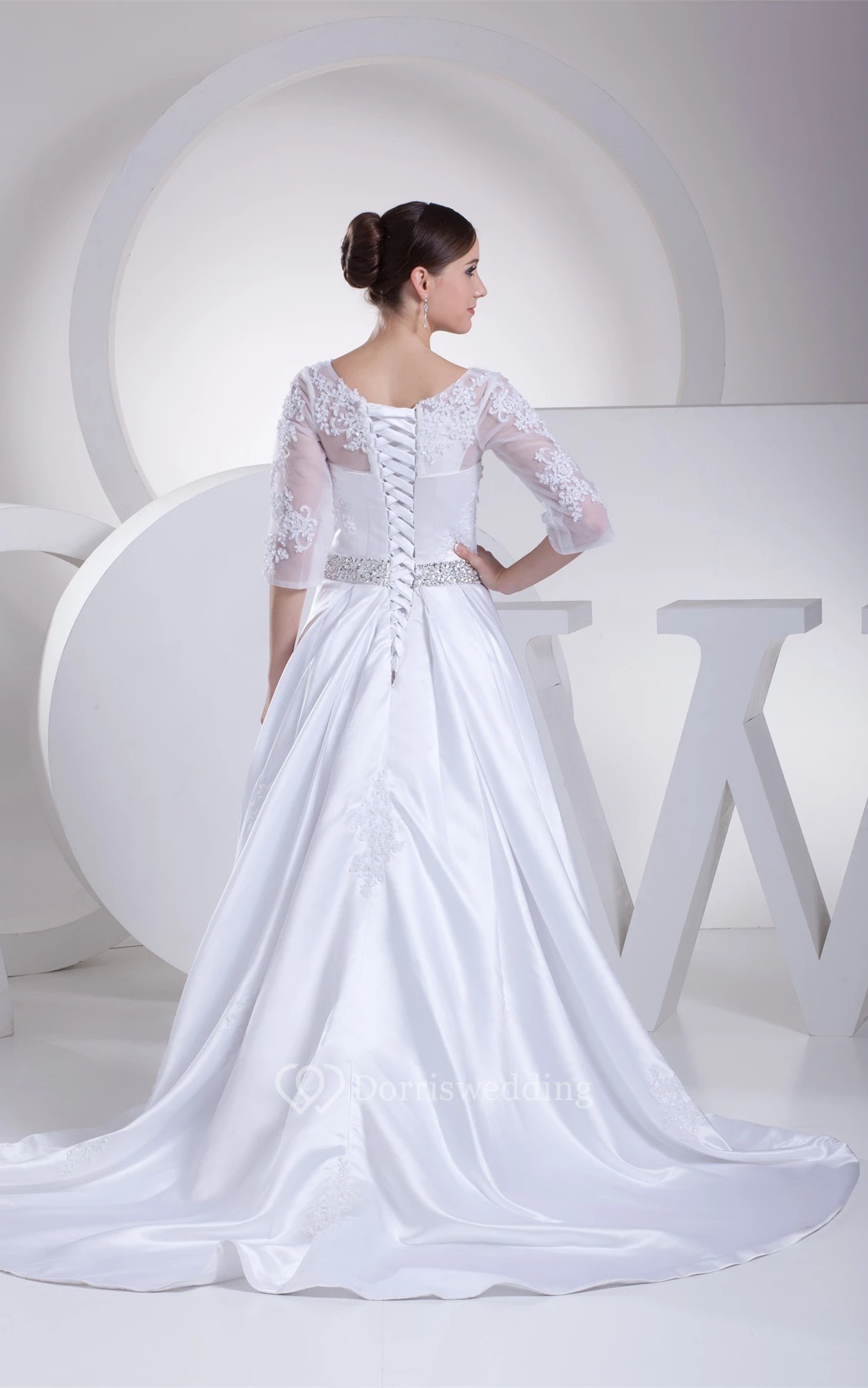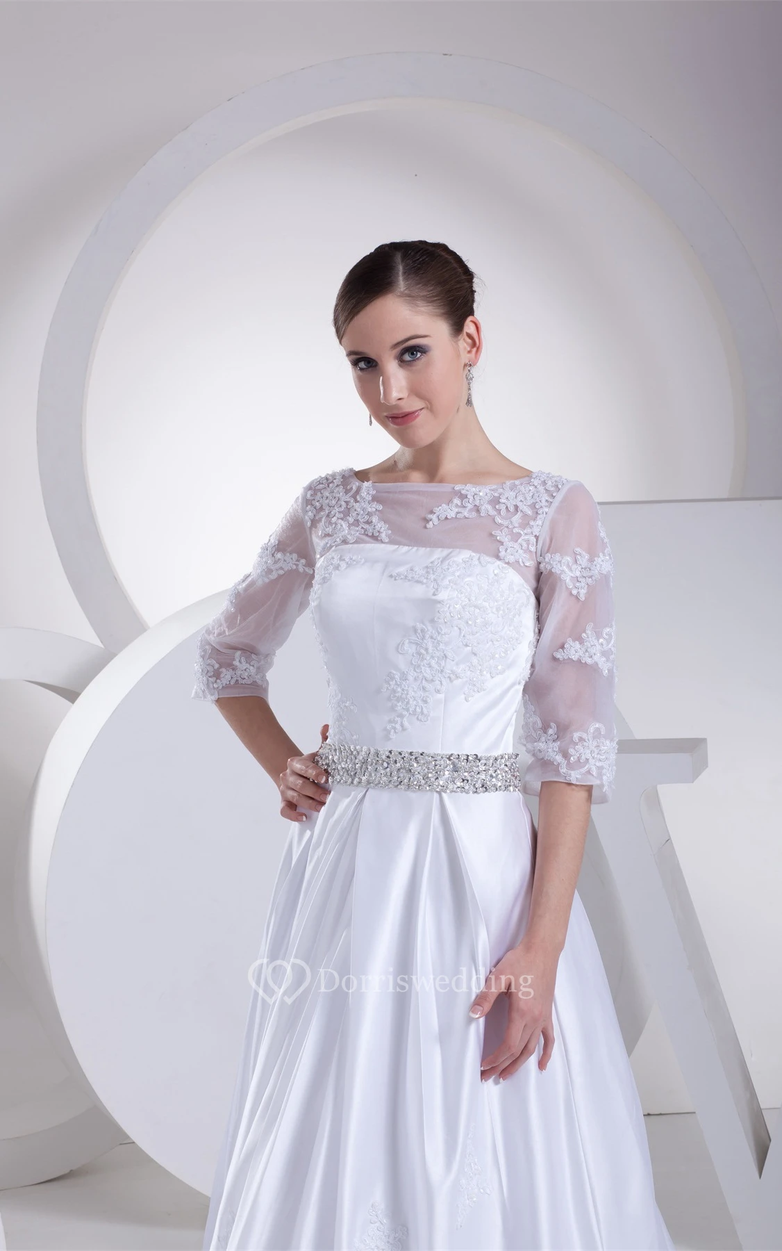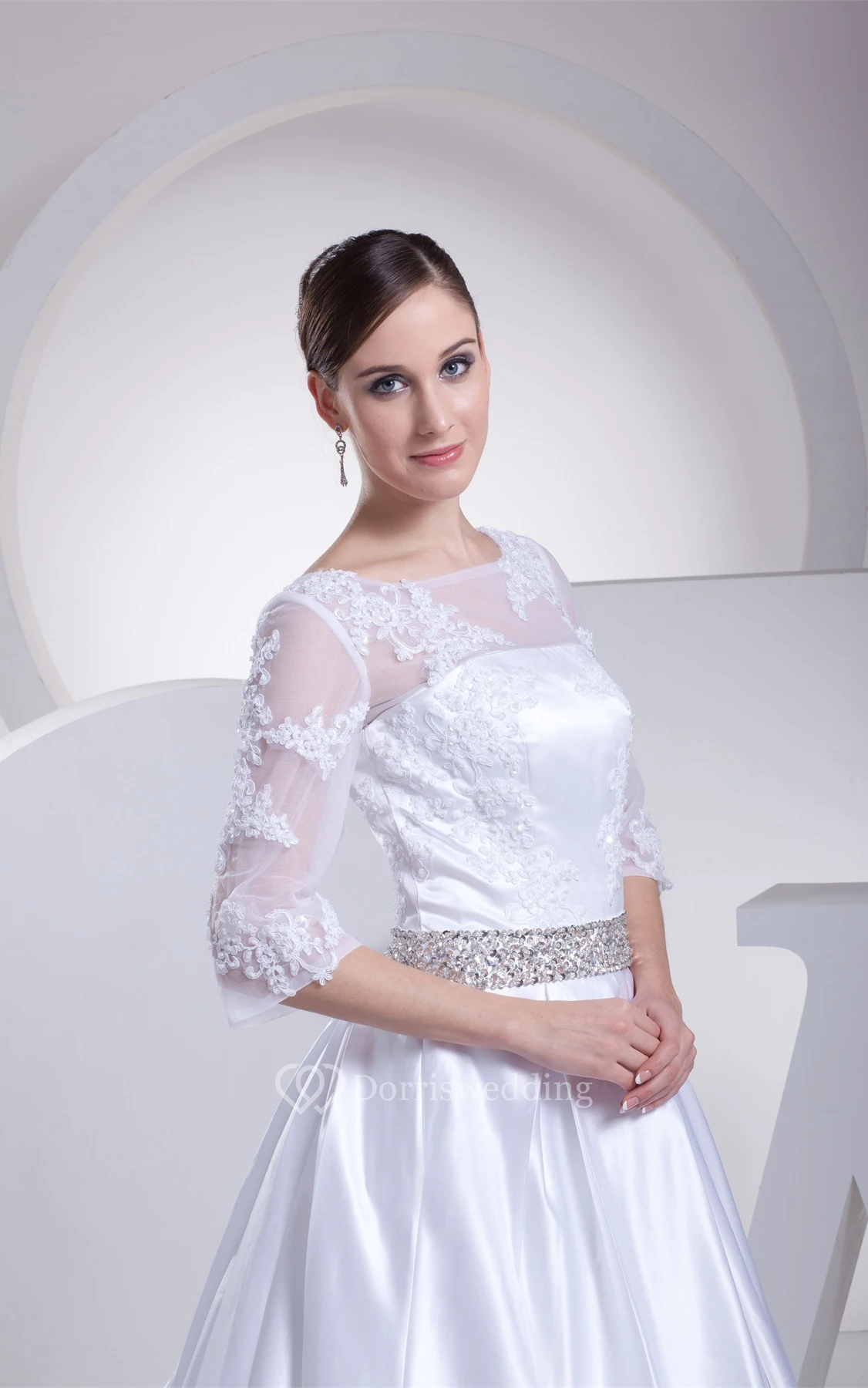 Long A-Line 3-4 Length Satin Sleeve Dress With Lace Illusion and Beading Belt