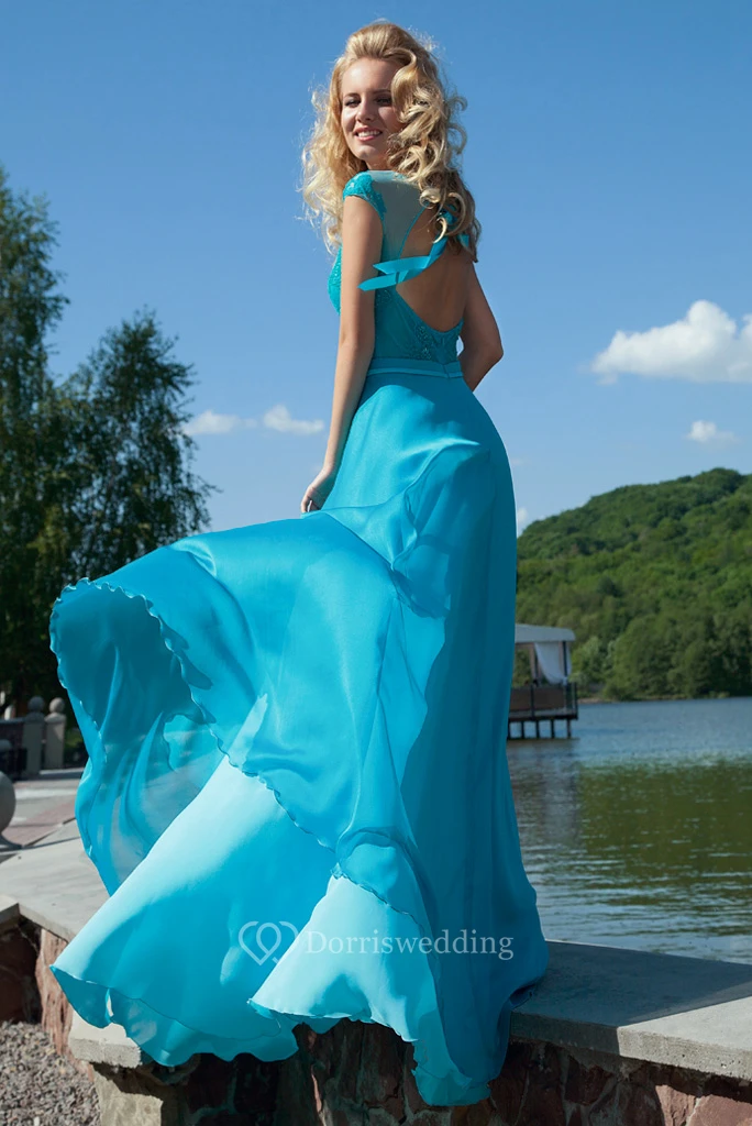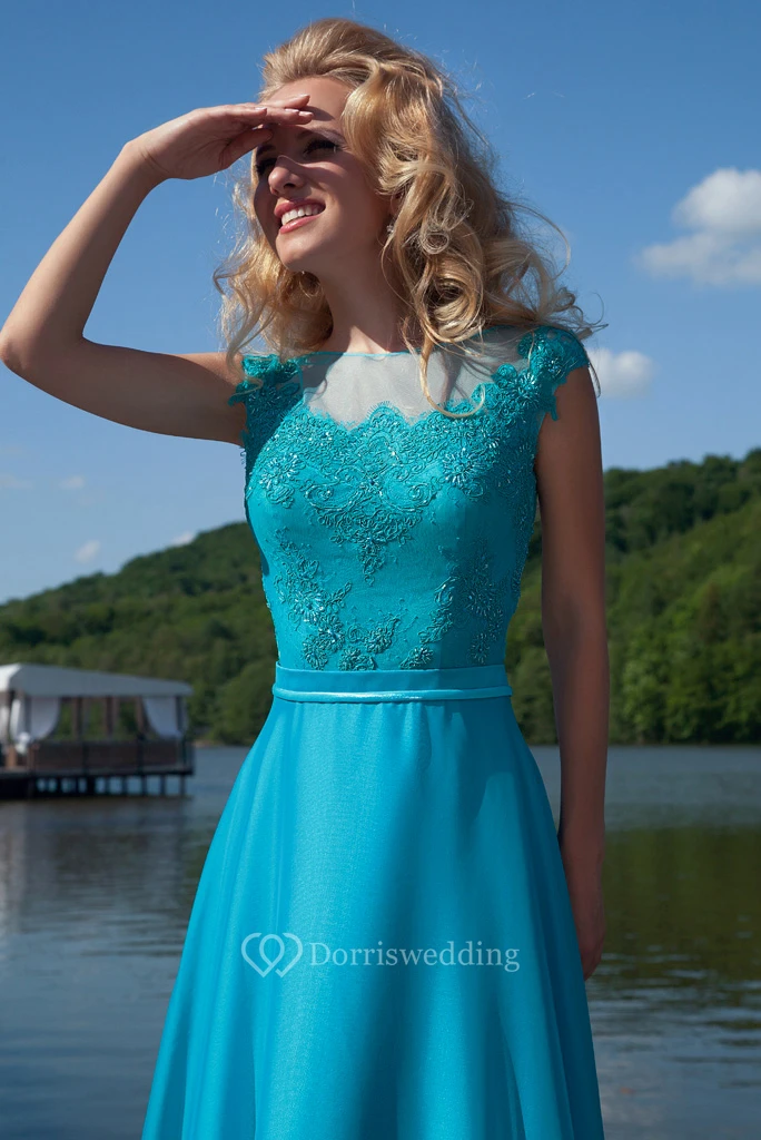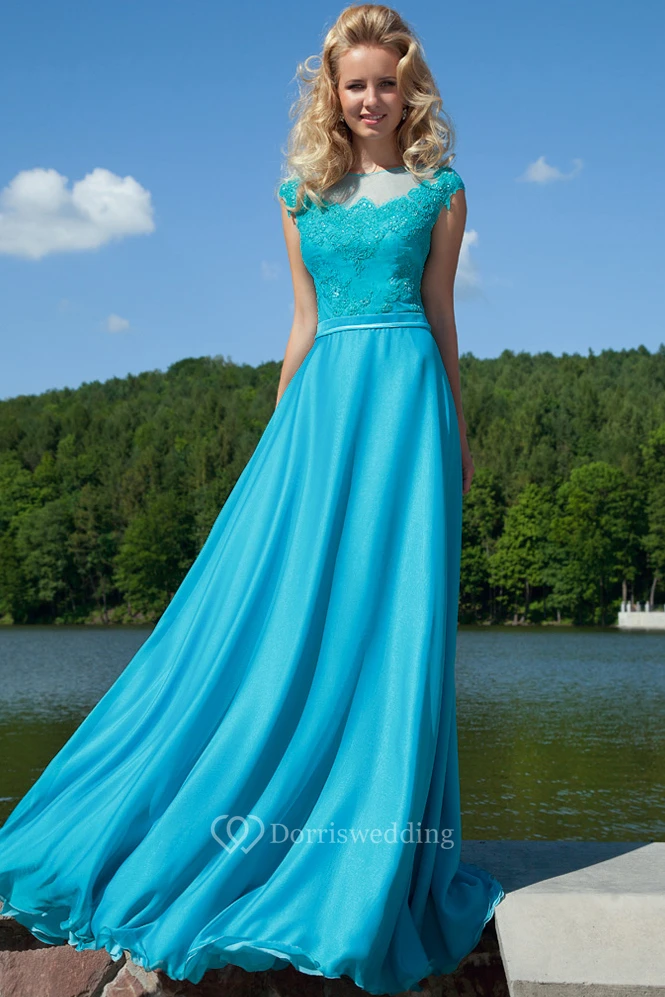 Long Appliqued Jewel-Neck Cap-Sleeve Chiffon Prom Dress With Bow