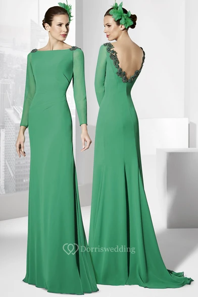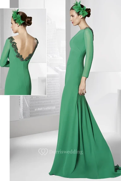 Long Appliqued Long-Sleeve Jewel-Neck Jersey Prom Dress