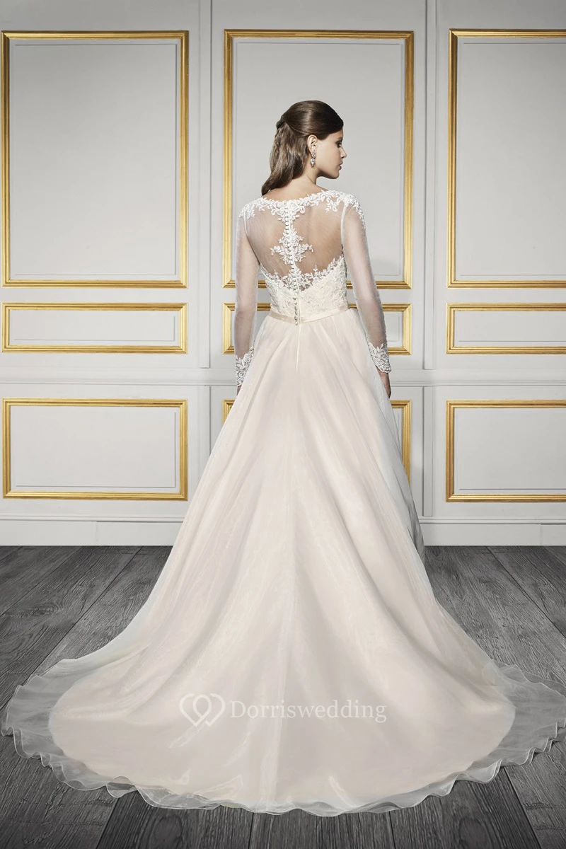 Long Bateau Appliqued Long-Sleeve Tulle Wedding Dress With Court Train And Illusion