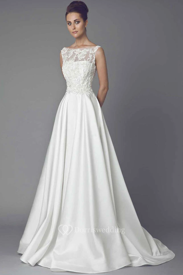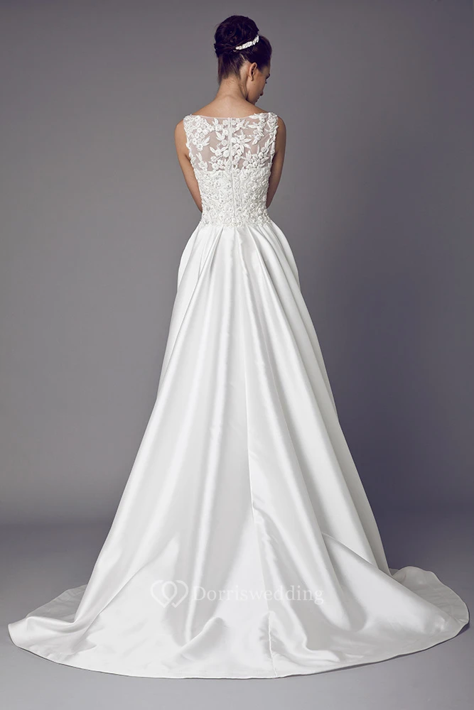 Long Bateau Appliqued Satin Wedding Dress With Sweep Train And Illusion