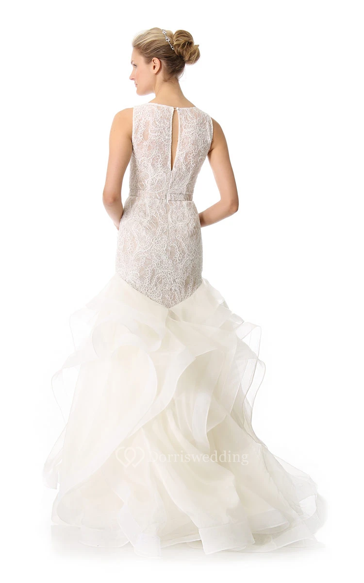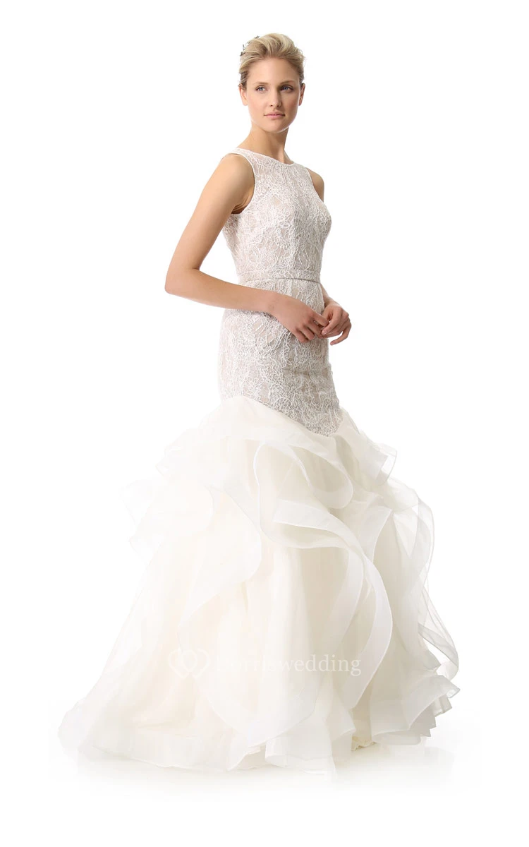Long Bateau Trumpet Taffeta Dress With Ruffles and Keyhole