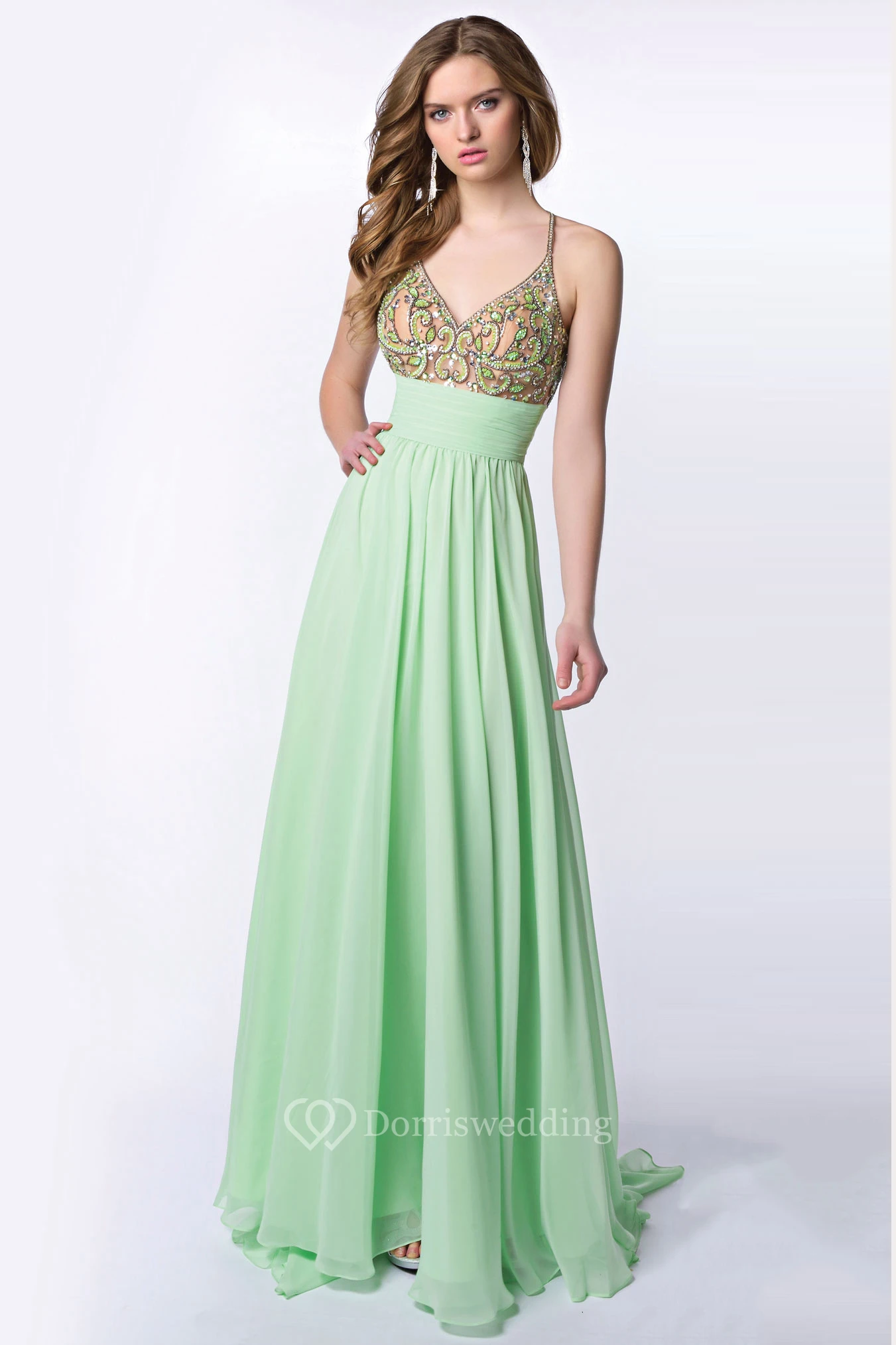 Long Chiffon A-Line V-Neck Homecoming Dress With Pleats And Cross Straps