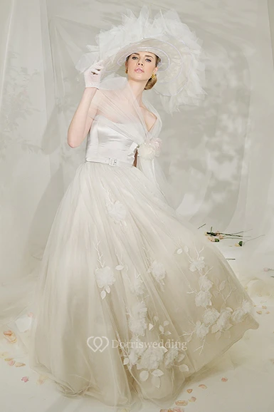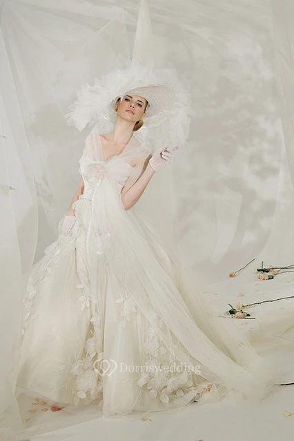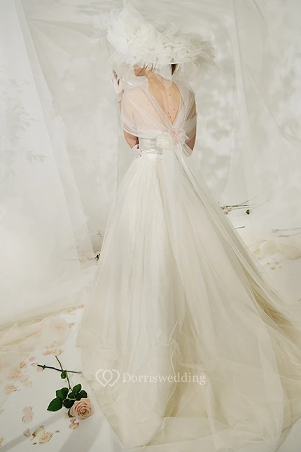 Long Floral Tulle Wedding Dress With Sweep Train And V Back