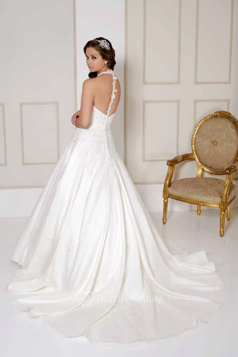 Long Halter Appliqued Satin Wedding Dress With Chapel Train And V Back