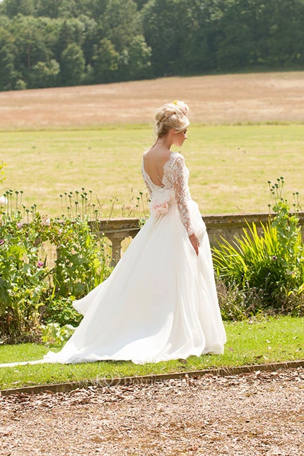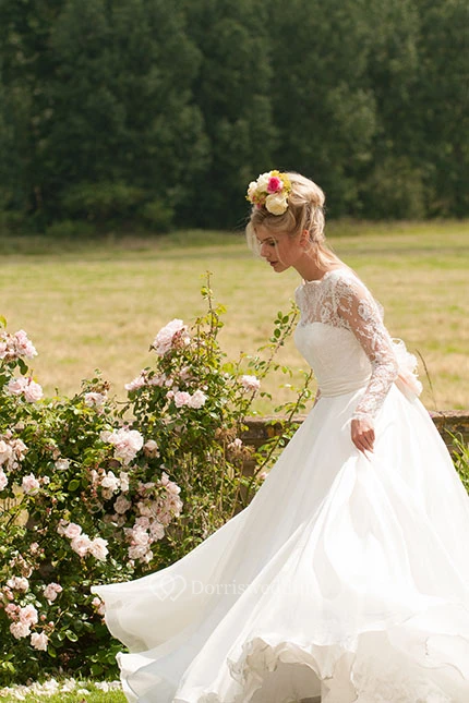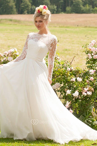Long High Neck Long-Sleeve Appliqued Chiffon Wedding Dress