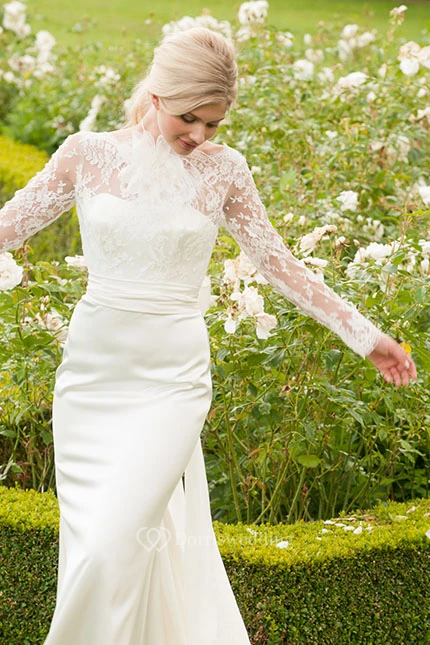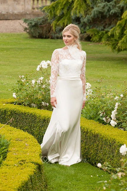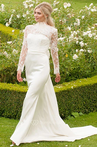 Long High Neck Long-Sleeve Floral Chiffon Wedding Dress With Sweep Train And V Back