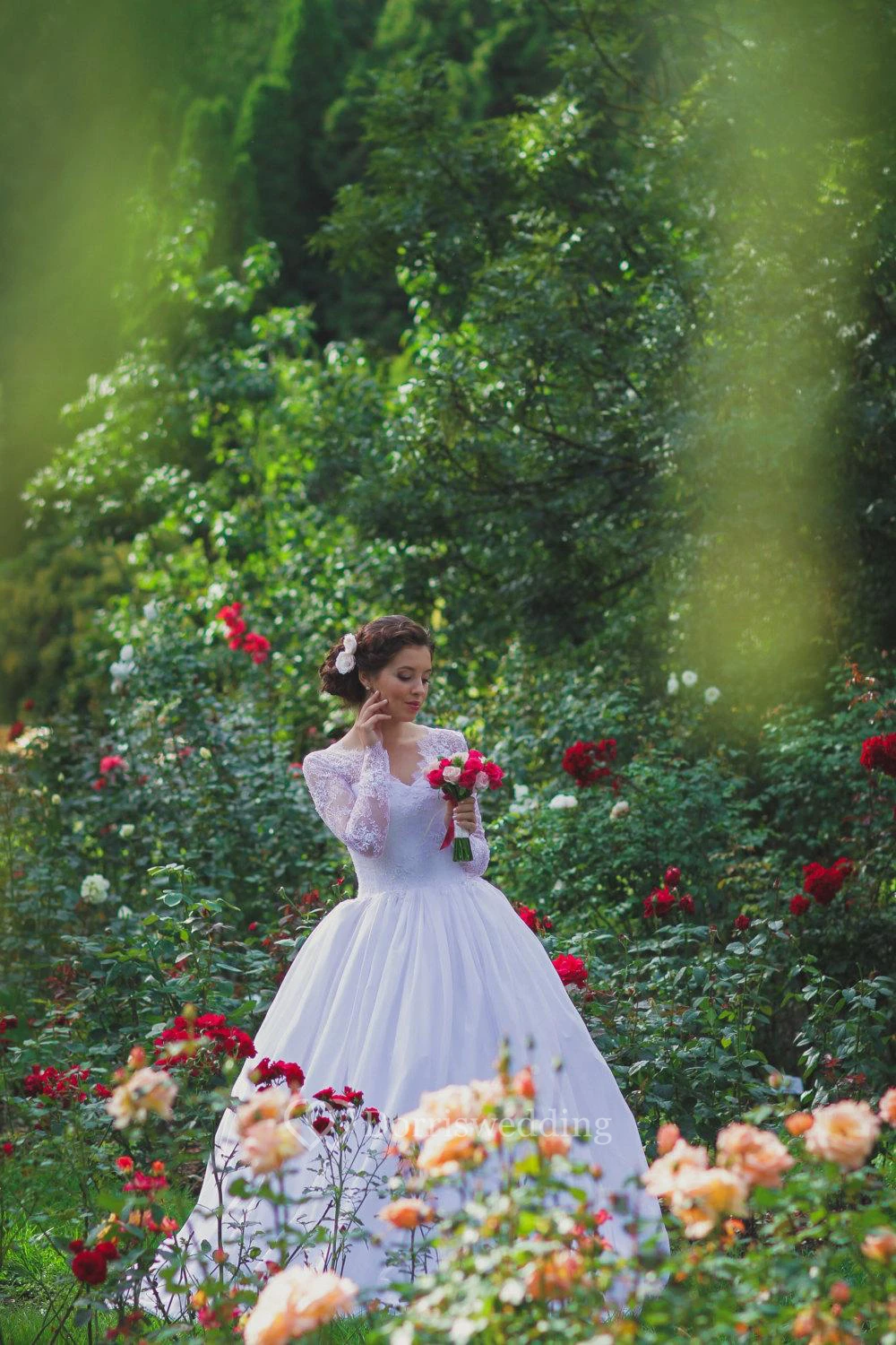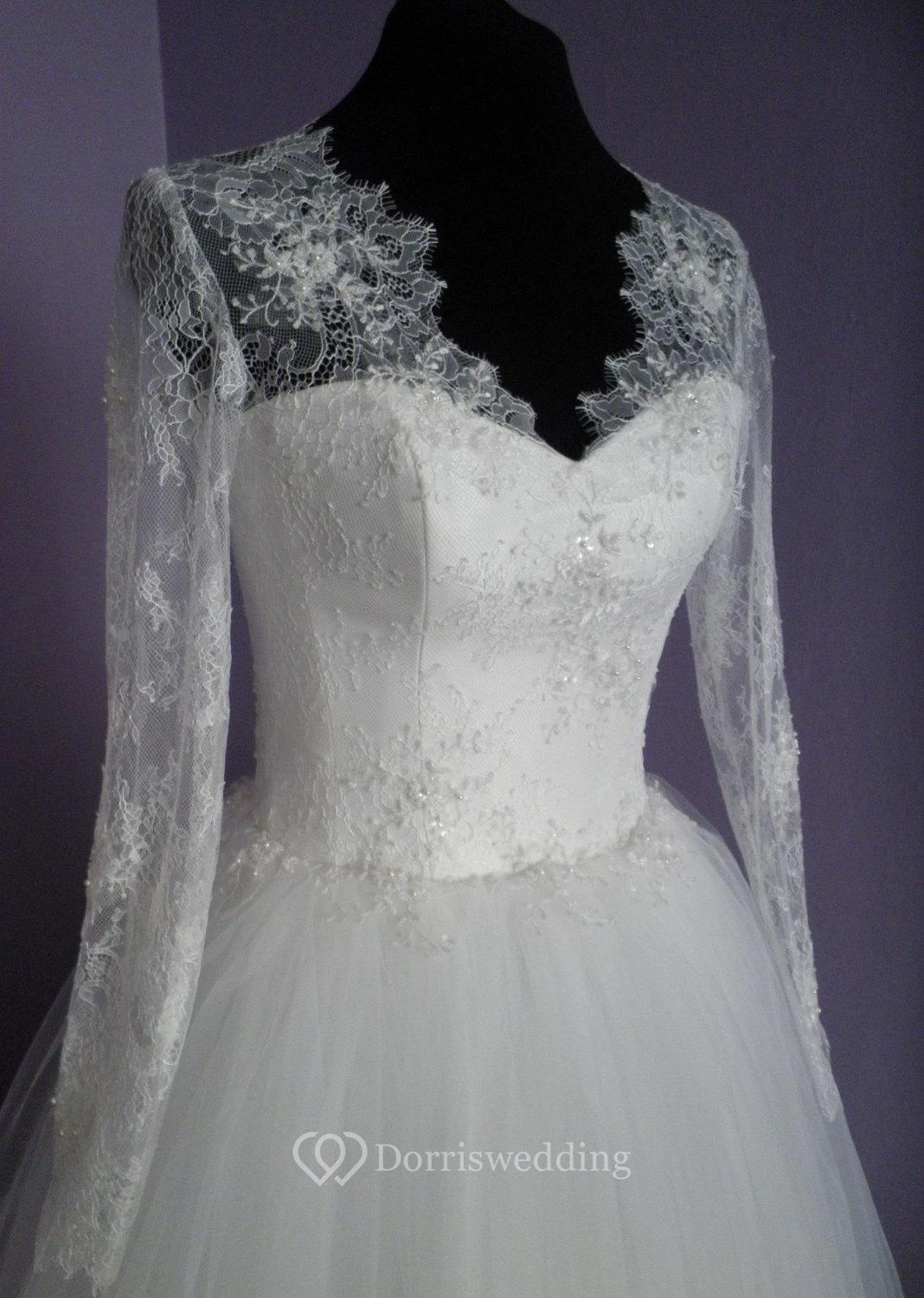 Long Illusion Sleeve Queen Anne Neckline A-Line Tulle Gown