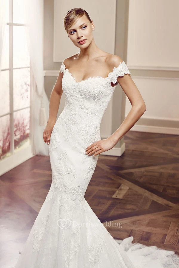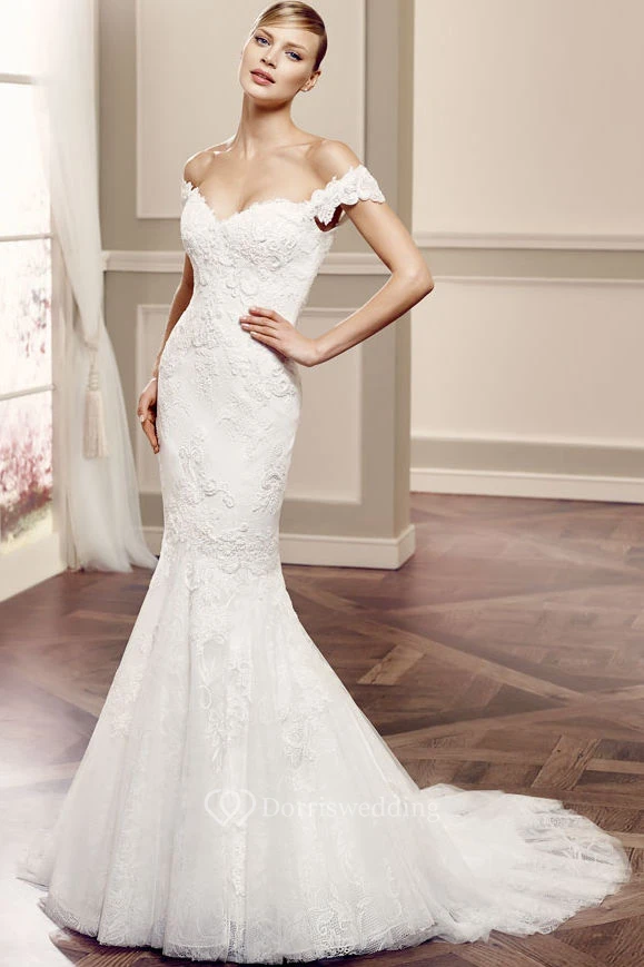 Long Off-The-Shoulder Appliqued Lace Wedding Dress With Court Train And V Back