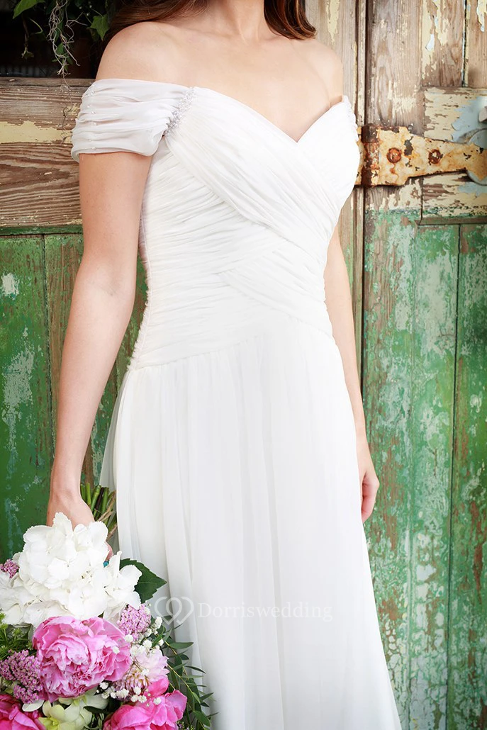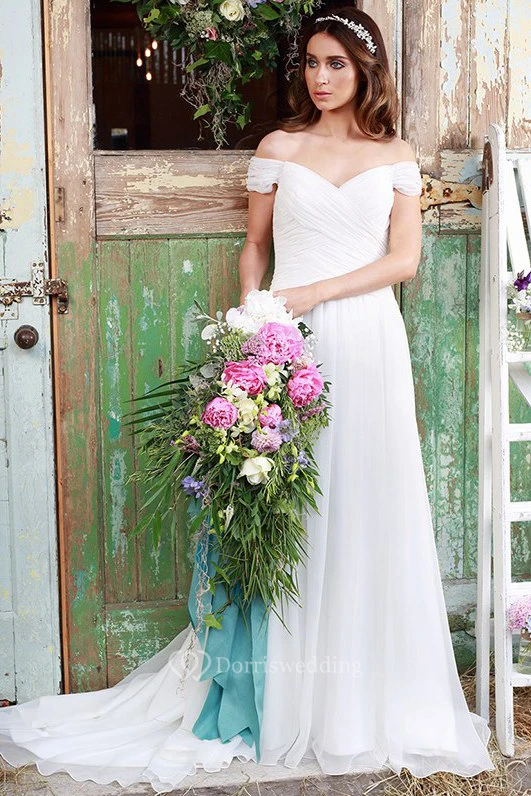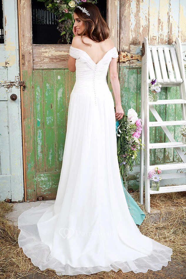 Long Off-The-Shoulder Ruched Tulle Wedding Dress