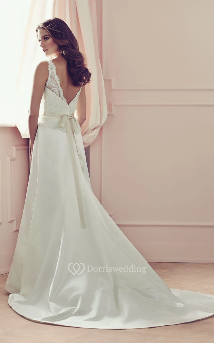 Long Satin Sleeveless Dress With Lace Bodice