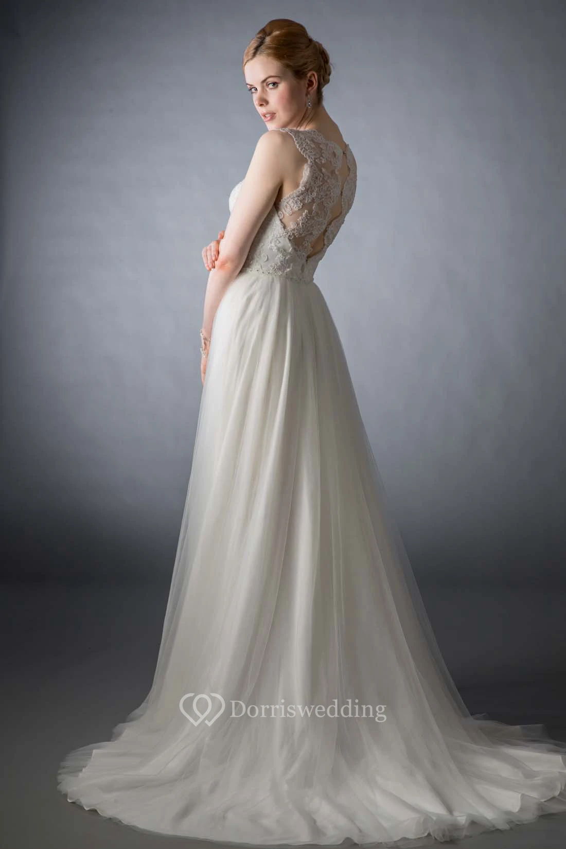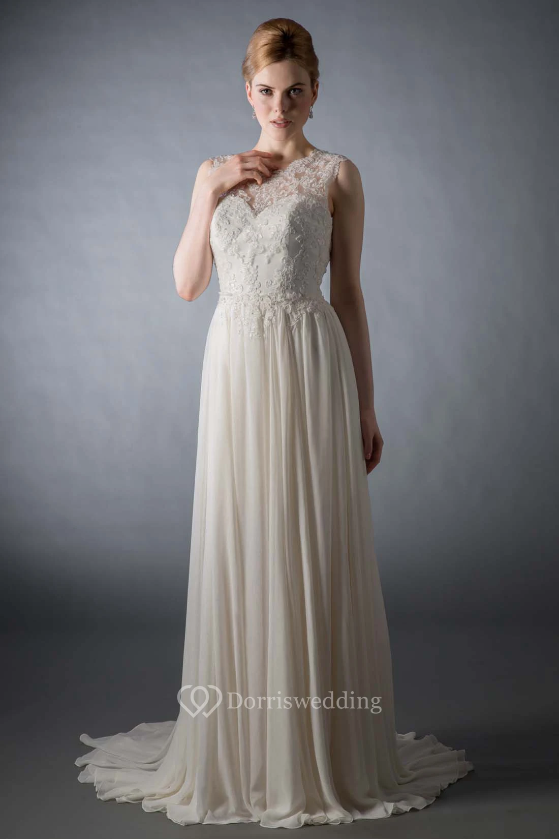Long Scoop Appliqued Chiffon Wedding Dress With Sweep Train And Illusion