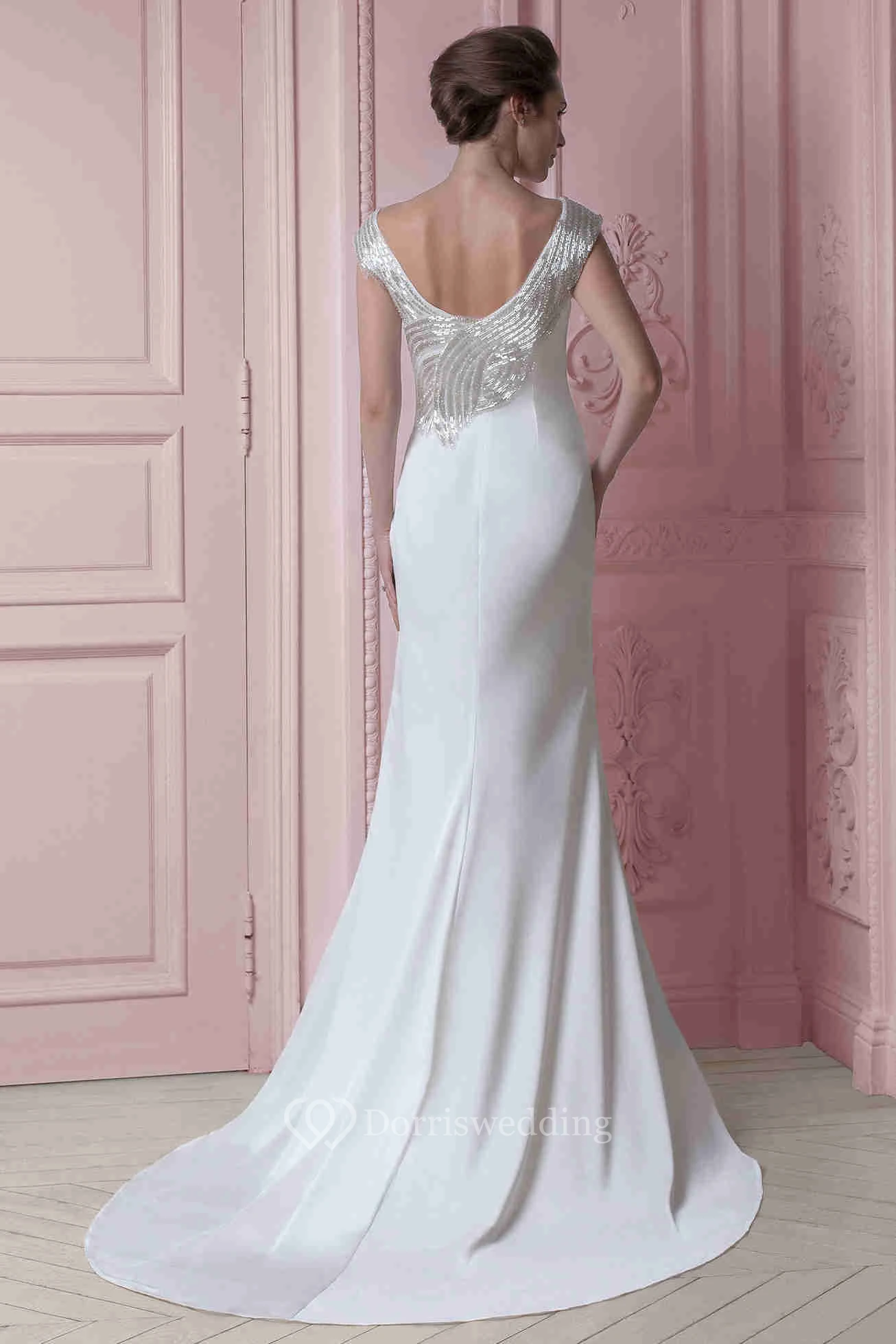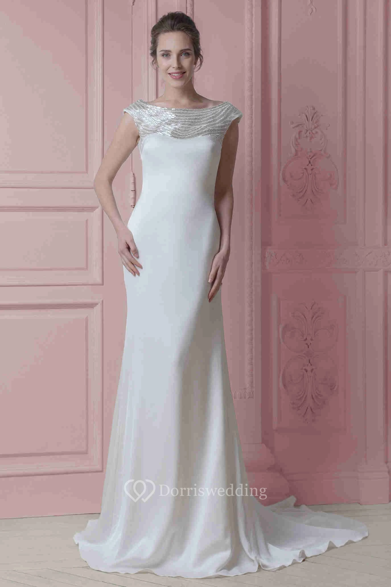 Long Scoop Beaded Cap-Sleeve Chiffon Wedding Dress With Sweep Train And V Back
