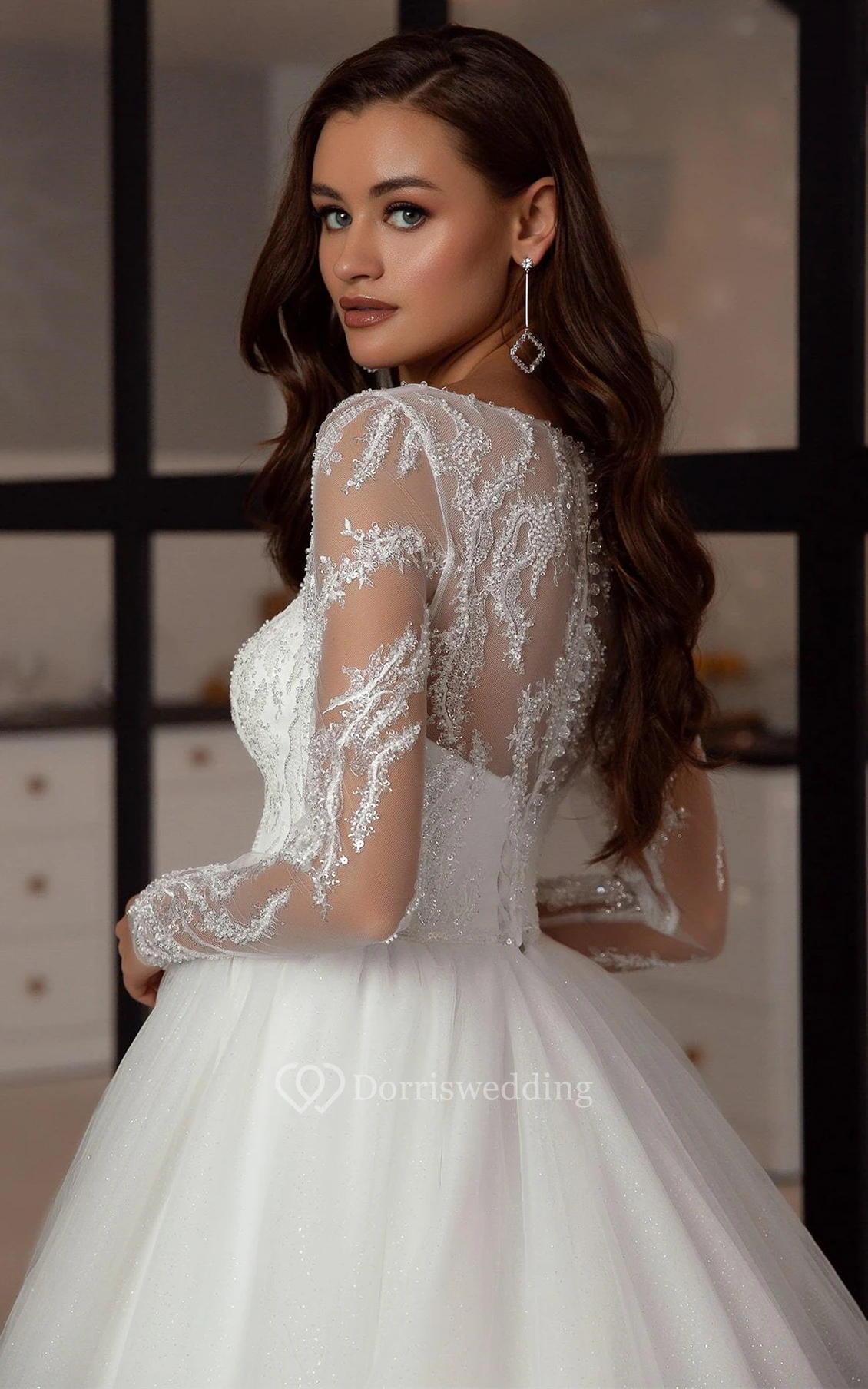 Long Sleeve A Line Modest Bateau Tulle Wedding Dress with Beading