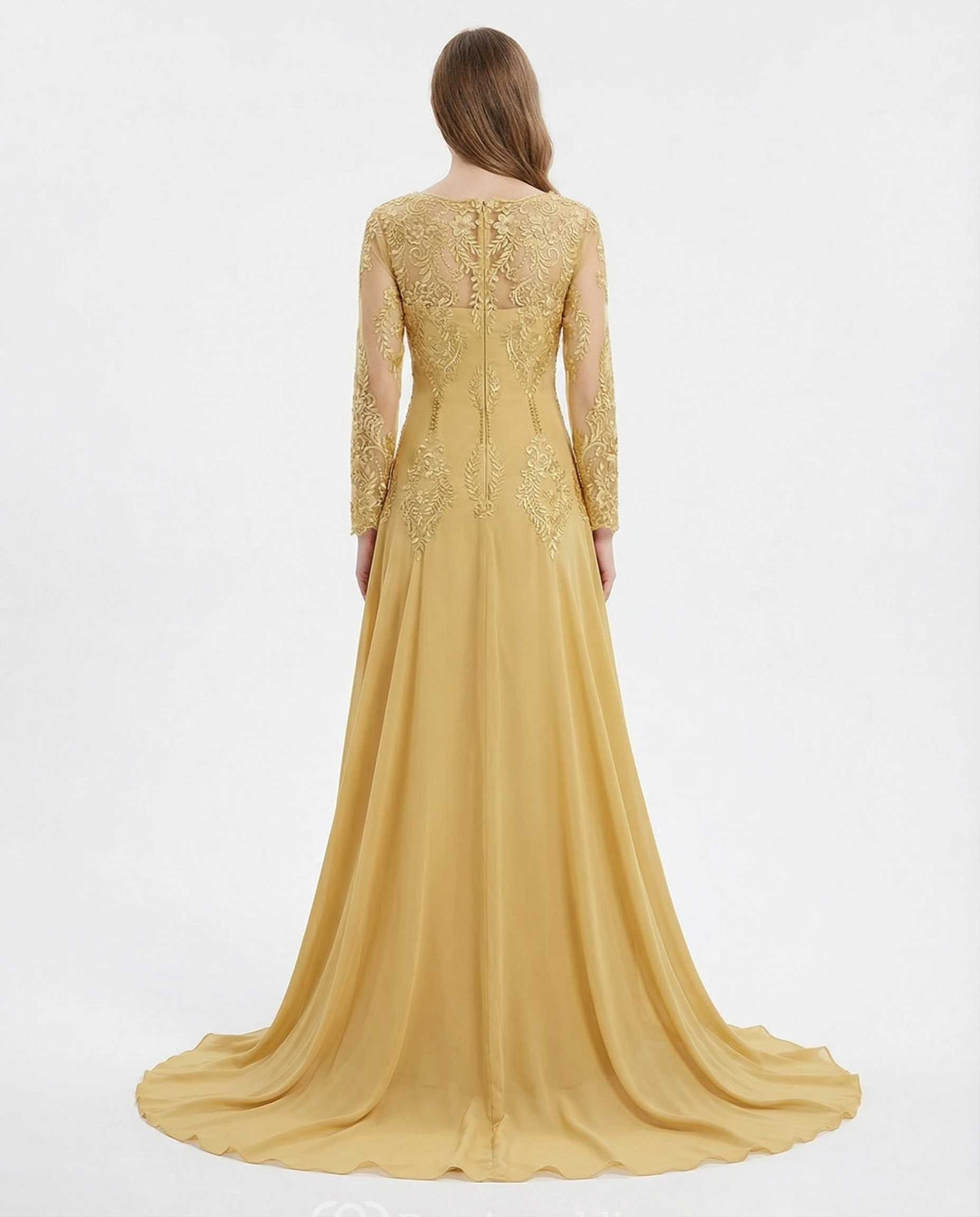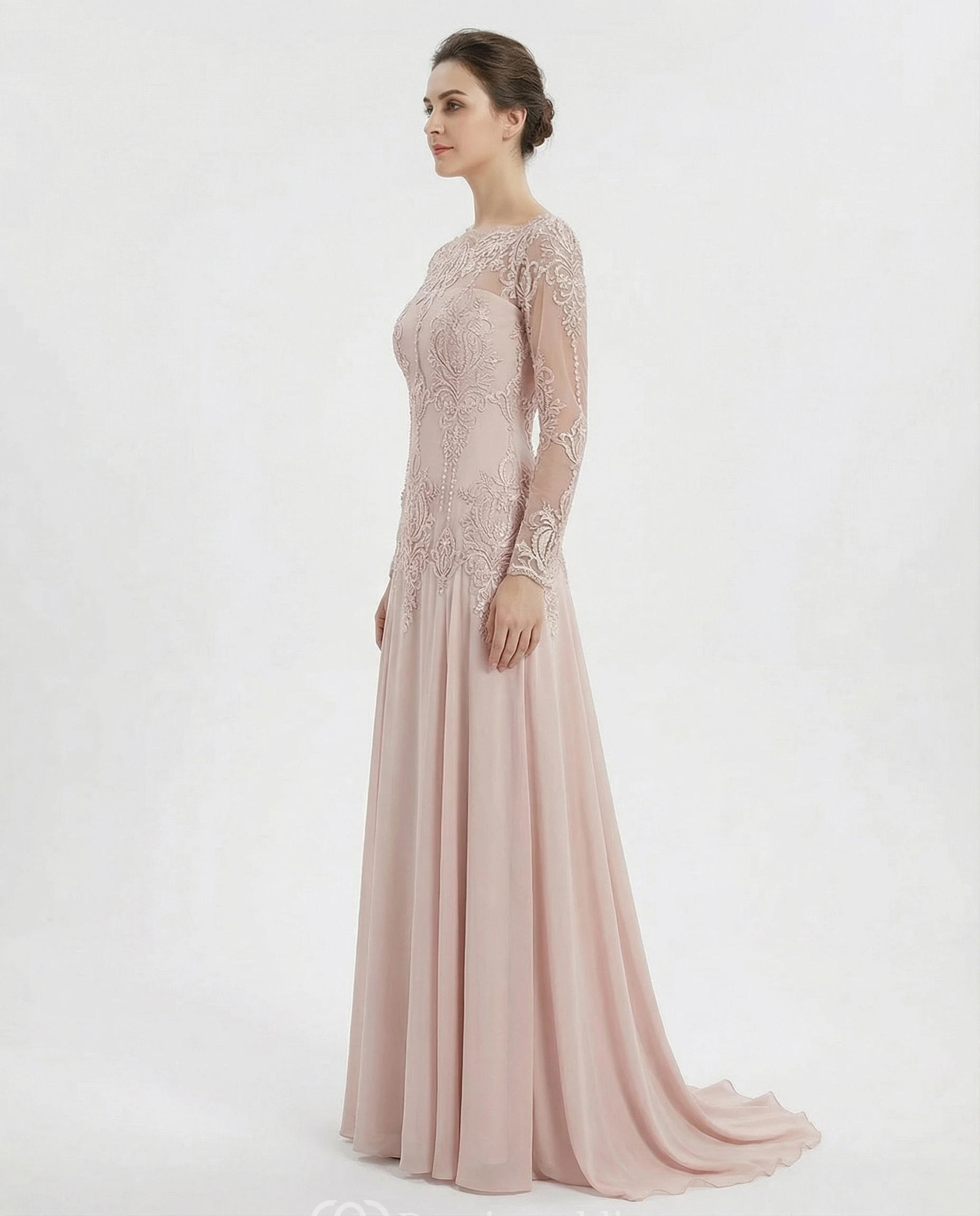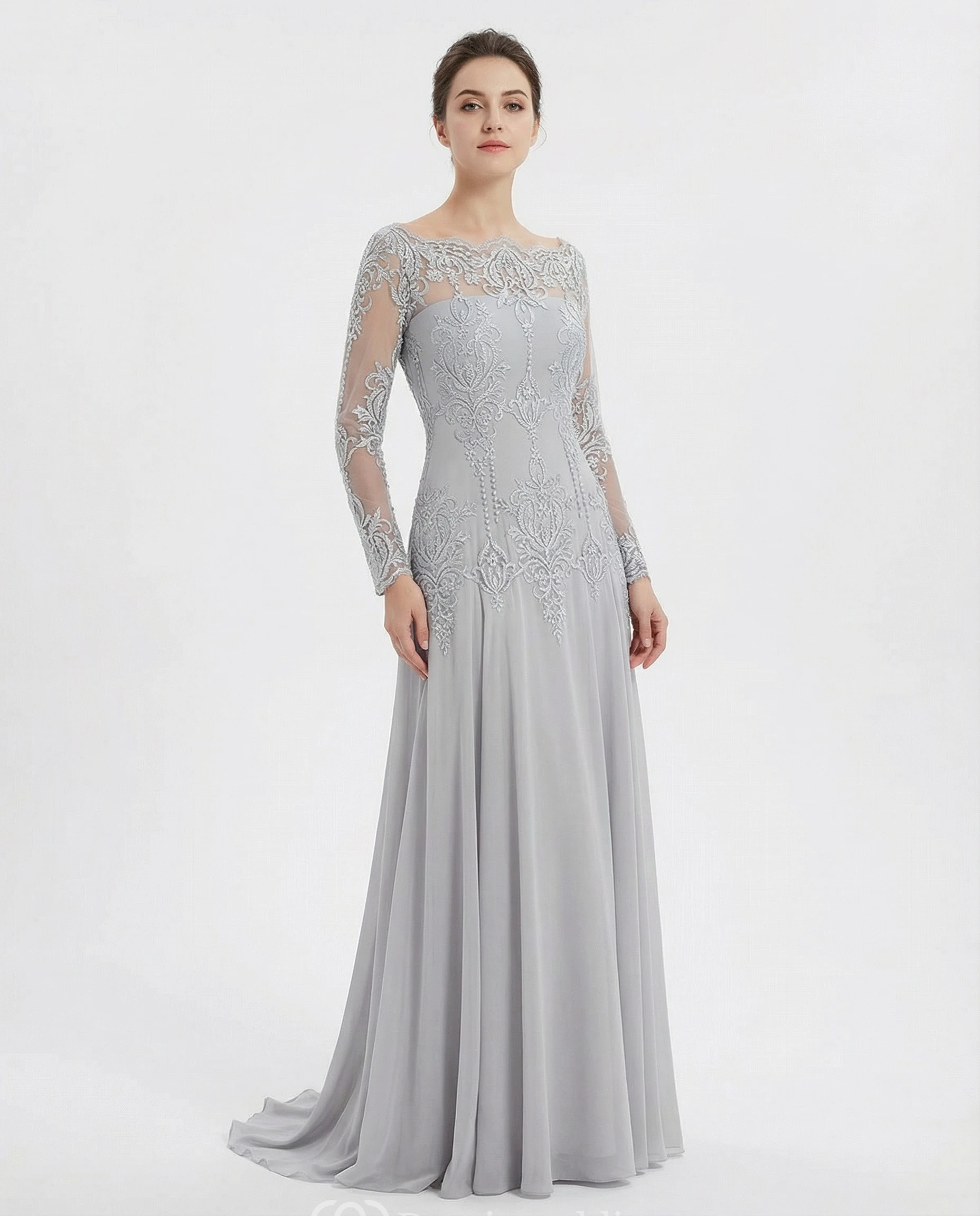 Long Sleeve Bateau Neck Lace & Chiffon MOB Gown