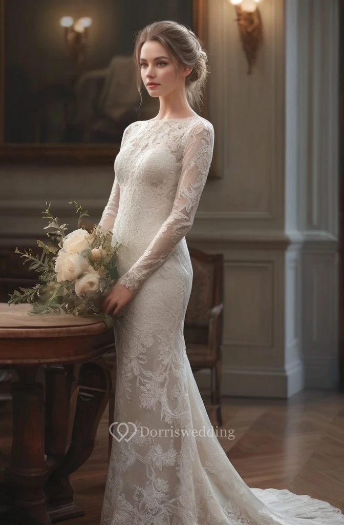 Long Sleeve Bateau-neck Sheath Court Train Illusion Wedding Dress