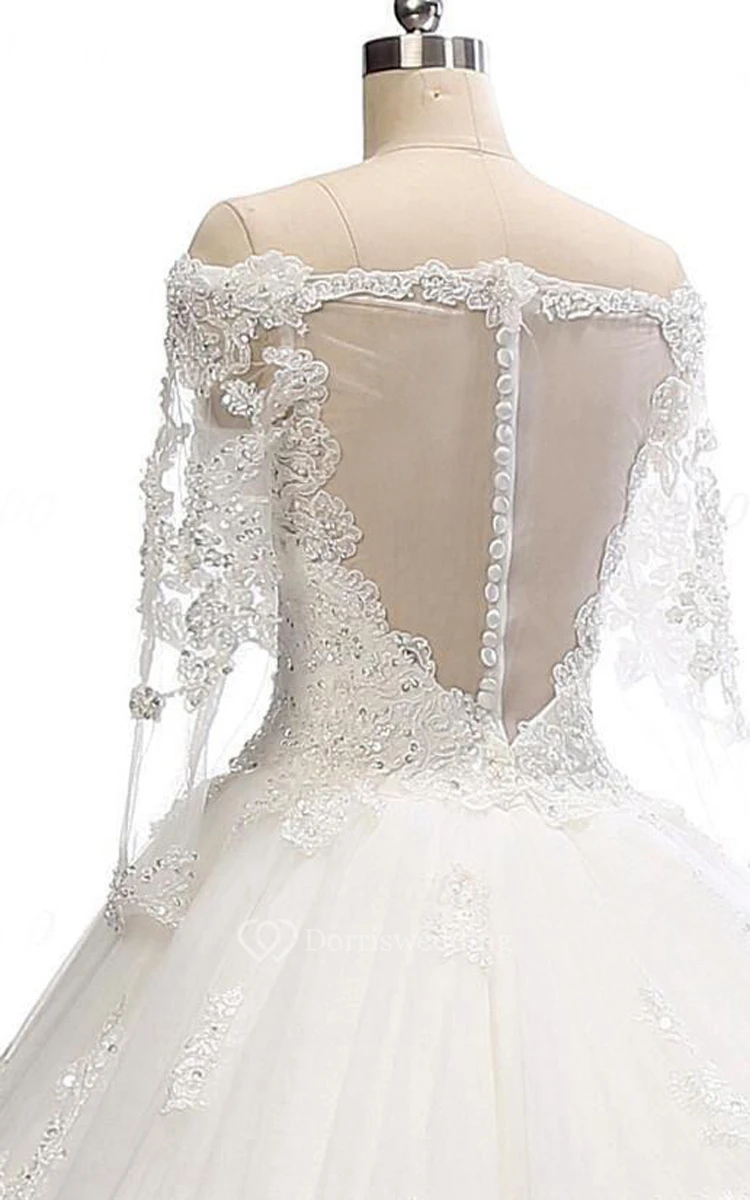 Long Sleeve Court Train Tulle Lace Dress With Beading Illusion
