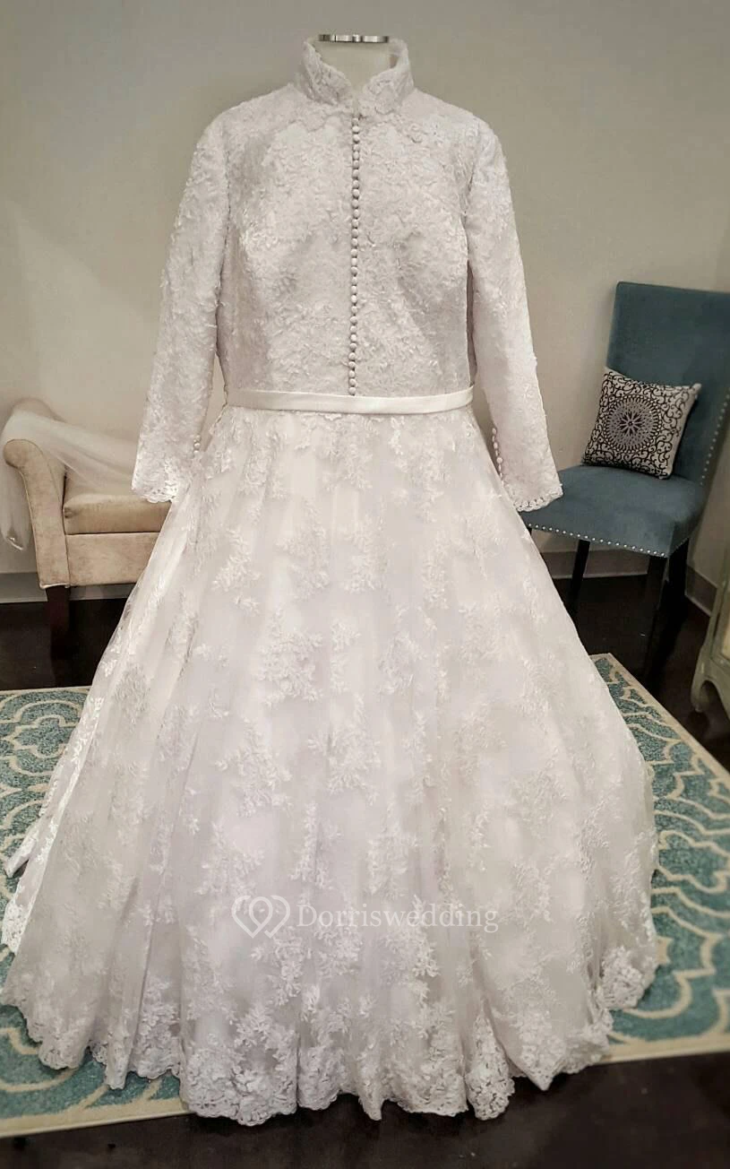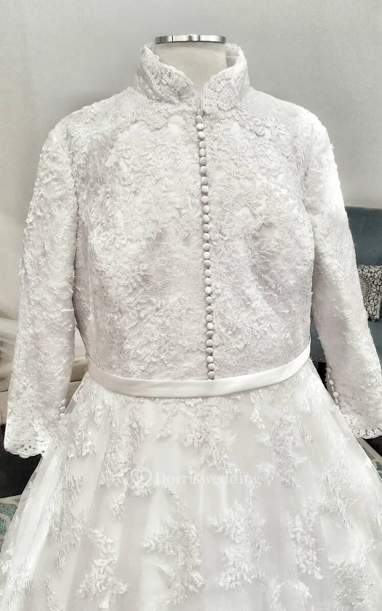 Long Sleeve High Neck A-Line Lace Dress With Slime Satin Belt