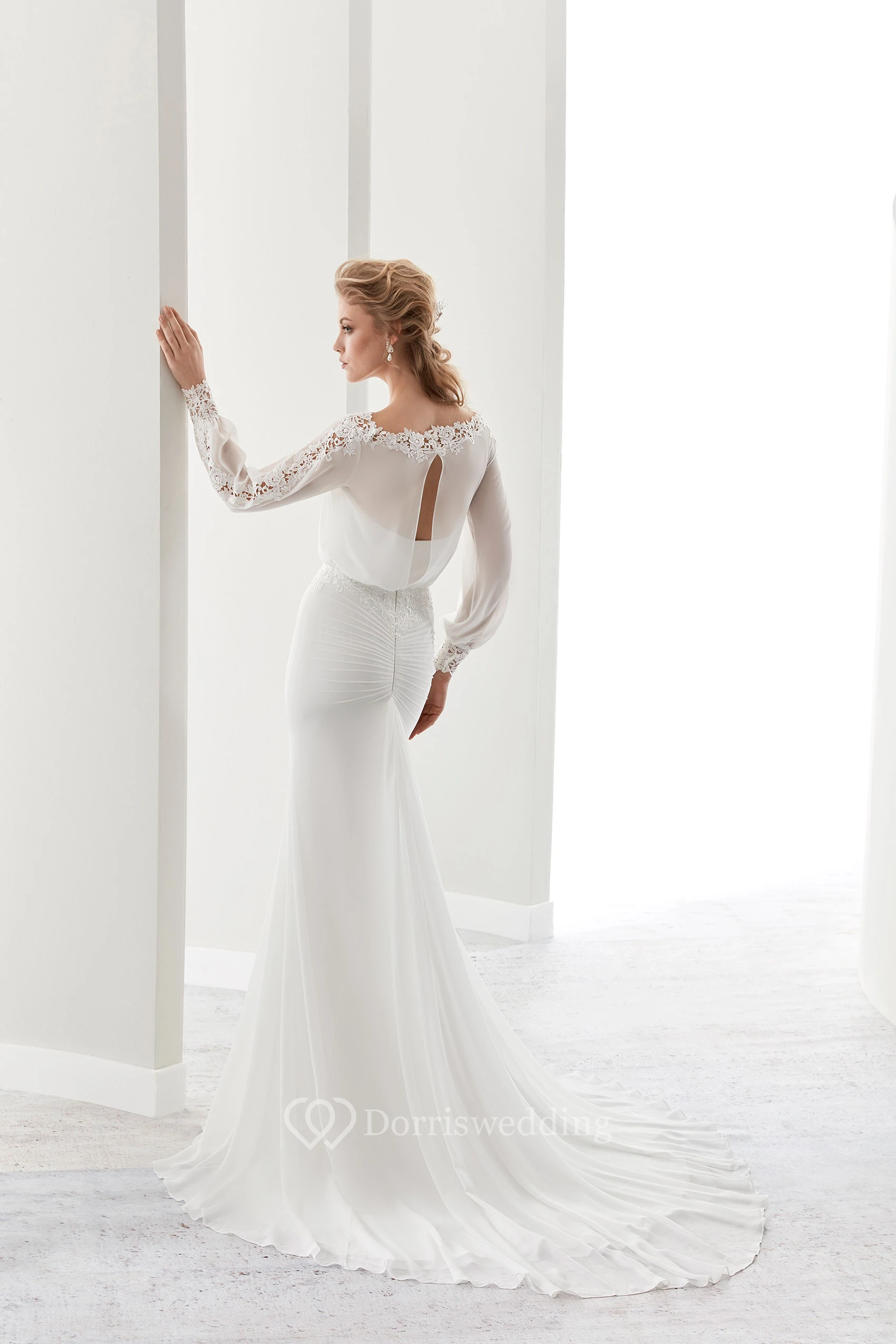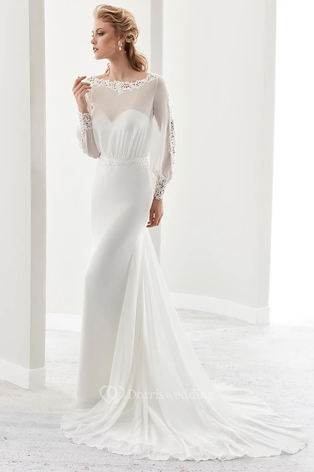 Long-Sleeve Jewel-Neck Sheath Gown With Illusion Design And Keyhole Back