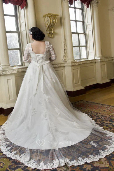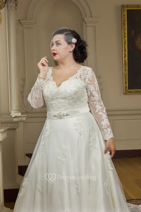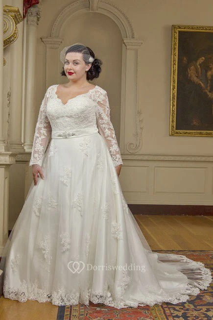 Long Sleeve Lace Bridal Gown With Crystal Satin Sash And Lace Up