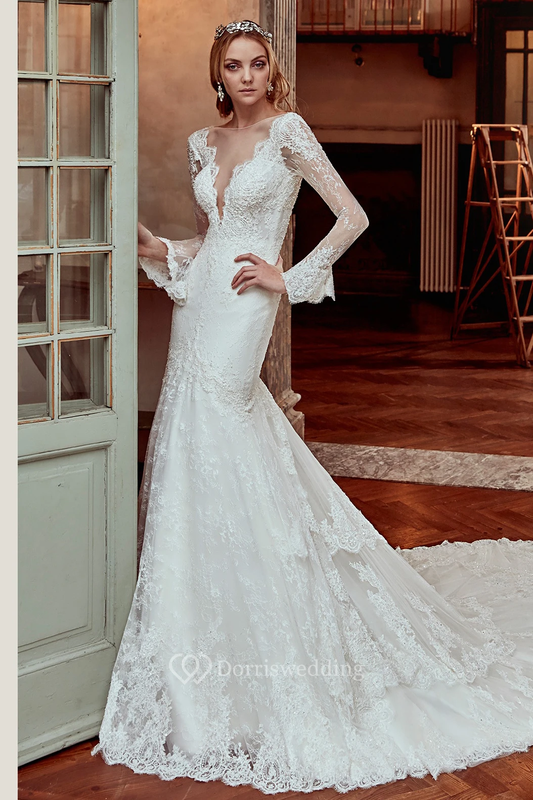 Long-Sleeve Lace Court-Train Wedding Dress With Deep-V Neck and Open Back