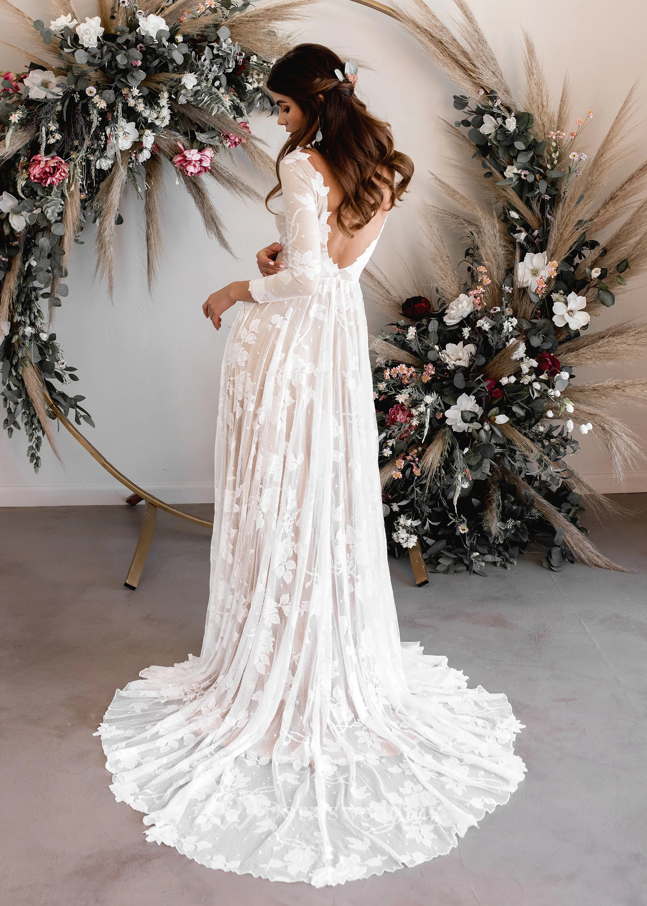 Long Sleeve Lace Empire Pleated Boho Beach Low-v Back Wedding Dress