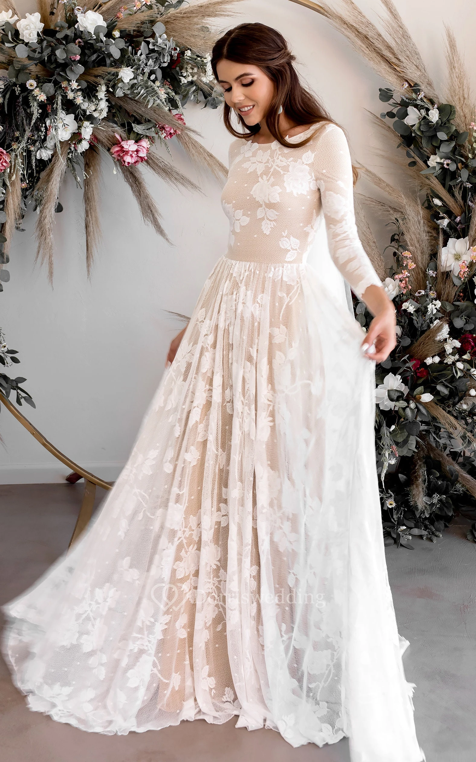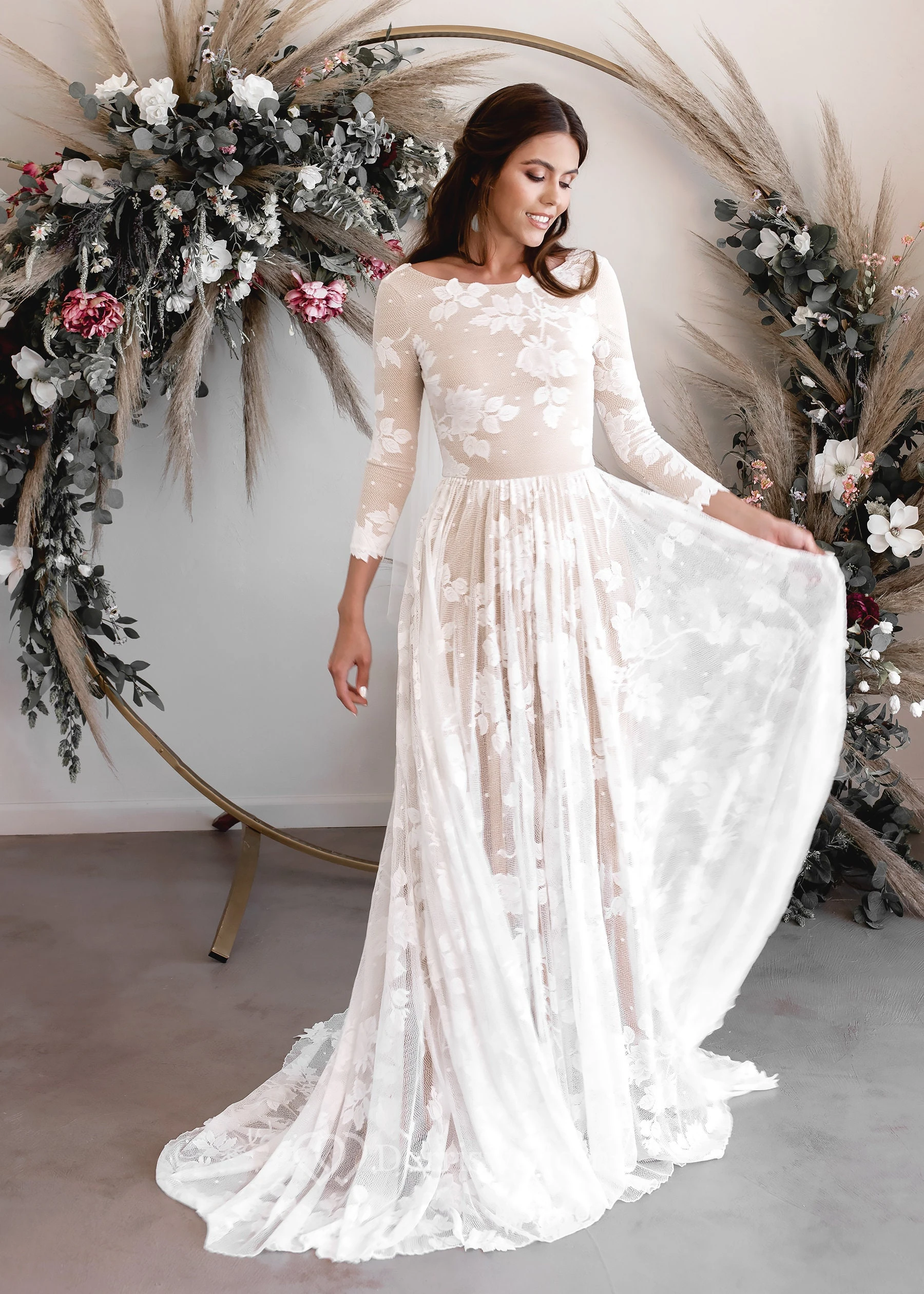 Simply leave a note in your shopping bag with any specific alterations you'd like. Our skilled tailors can transform this dress into your dream modest wedding gown!