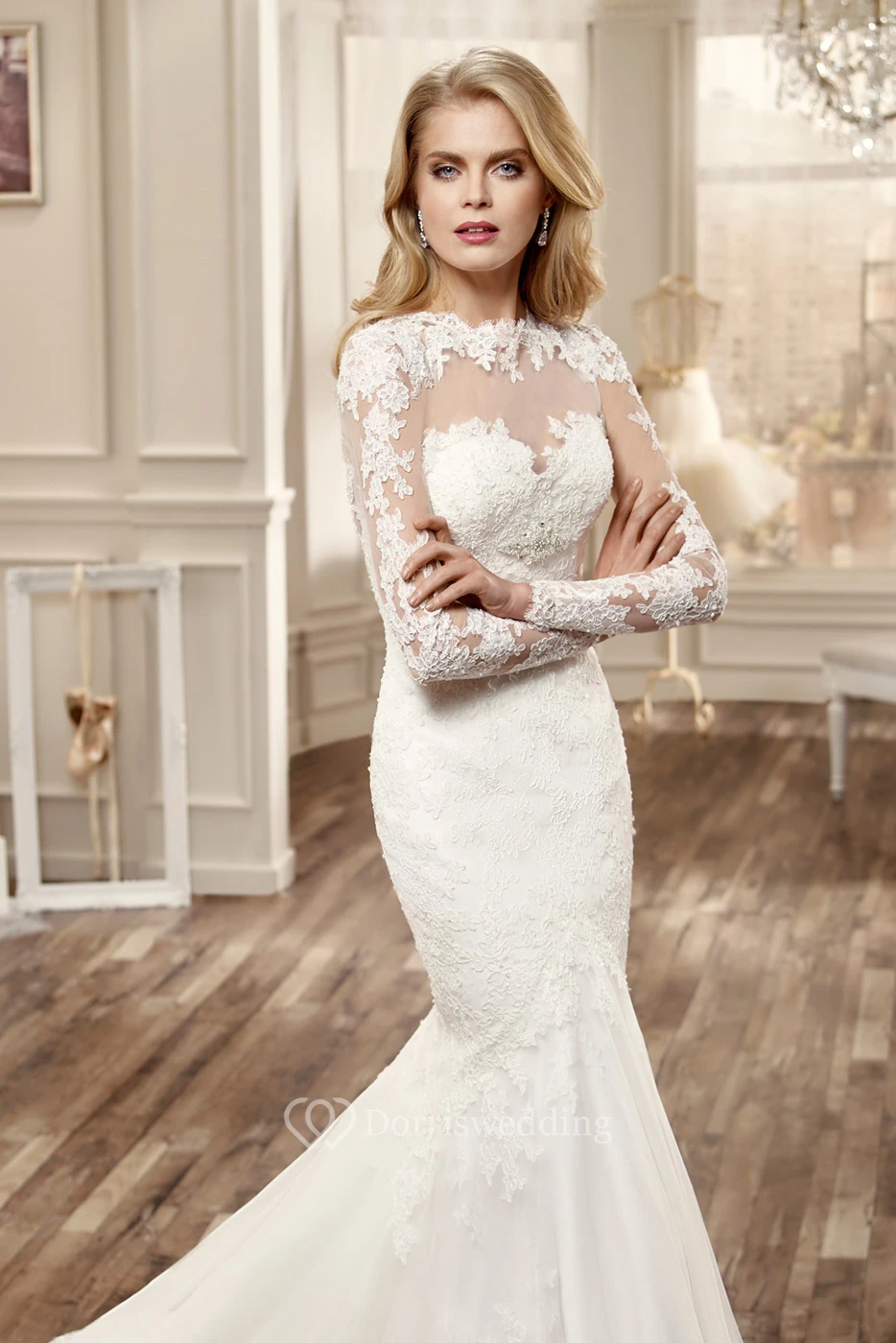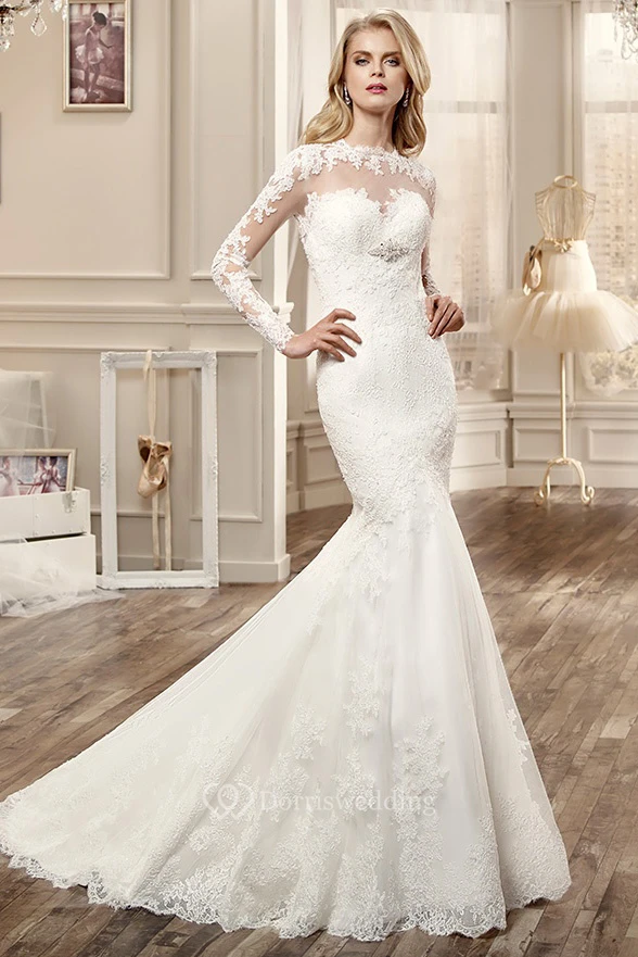 Long-Sleeve Mermaid Wedding Dress With Keyhole Back And Appliques